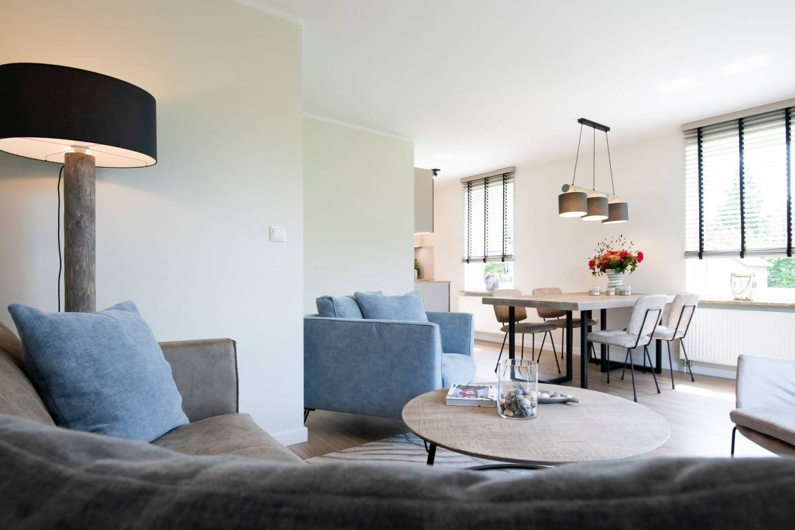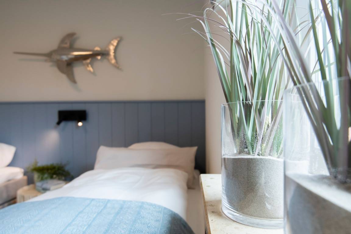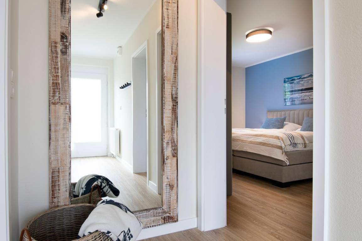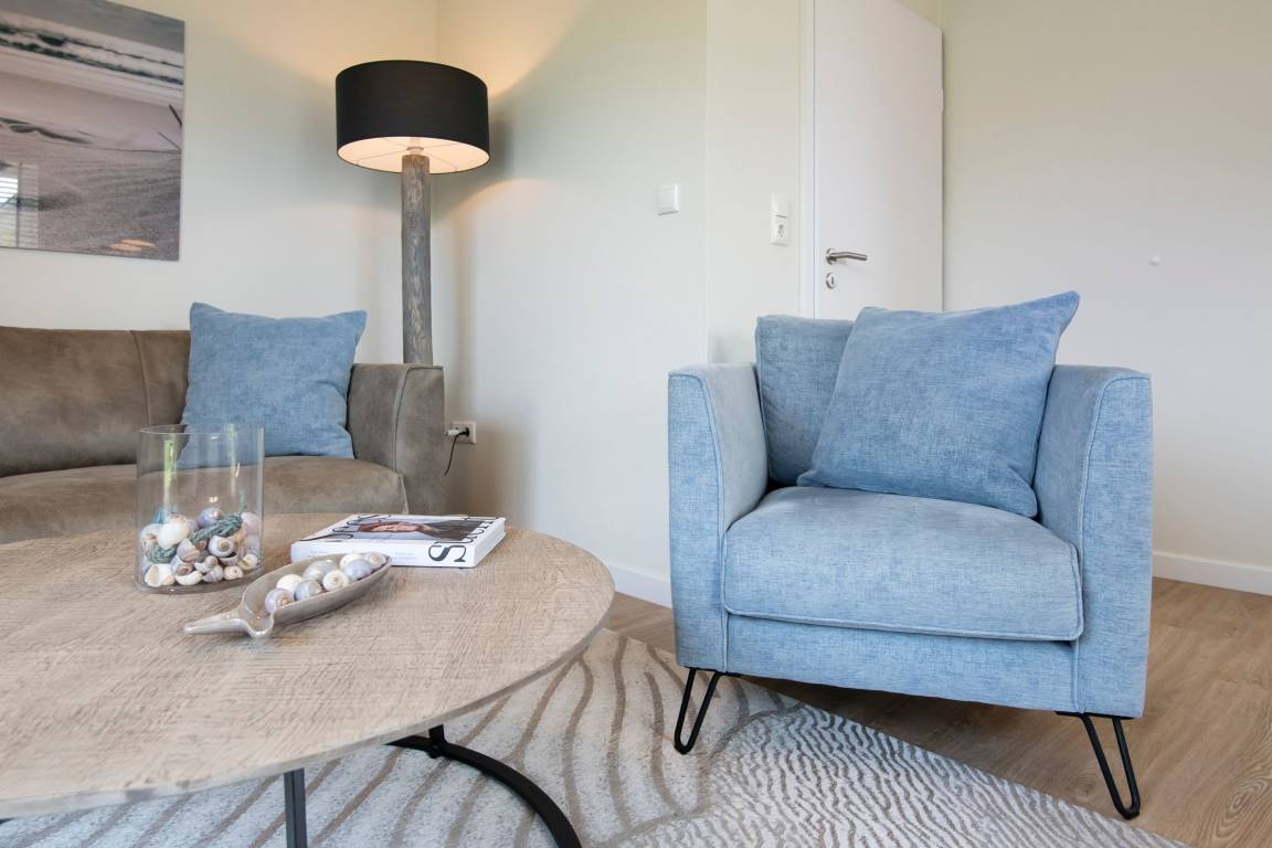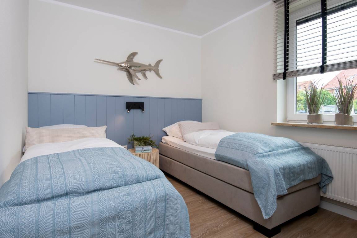 Der kombinierte Wohn- und Essbereich mit angrenzender Küche überzeugt durch eine stilvolle, zeitlose Einrichtung mit maritimen Details. Im Wohnbereich erwartet Sie ein bequemes Sofa, ein Sessel sowie ein Smart-TV-Flachbildfernseher. Der Esstisch bietet ausreichend Platz für die ganze Familie. Die offene Küche ist modern und gut ausgestattet. Ihnen stehen Annehmlichkeiten wie z. B. ein Backofen, ein Kühlschrank, ein Geschirrspüler sowie eine Kaffeemaschine zur Verfügung. Ein separates Schlafzimmer erwartet Sie mit einem komfortablen Boxspring-Doppelbett (2x 90x200 cm, durchgehender Topper), einem Kleiderschrank und einem Flachbildfernseher. Das weitere, separate Schlafzimmer ist mit zwei Einzel-Boxspringbetten (je 80x200 cm) ausgestattet. Beide Schlafzimmer lassen sich mit Außenrolläden angenehm abdunkeln. Das hell geflieste Badezimmer mit Fenster verfügt neben einem WC und einem Waschbecken über eine Dusche. Die möblierte Terrasse eignet sich ideal, um dort viele schöne Urlaubsstunden zu verbringen. Eine Markise schützt Sie im Sommer vor der Sonne.
