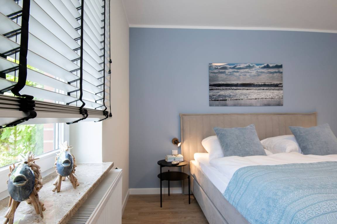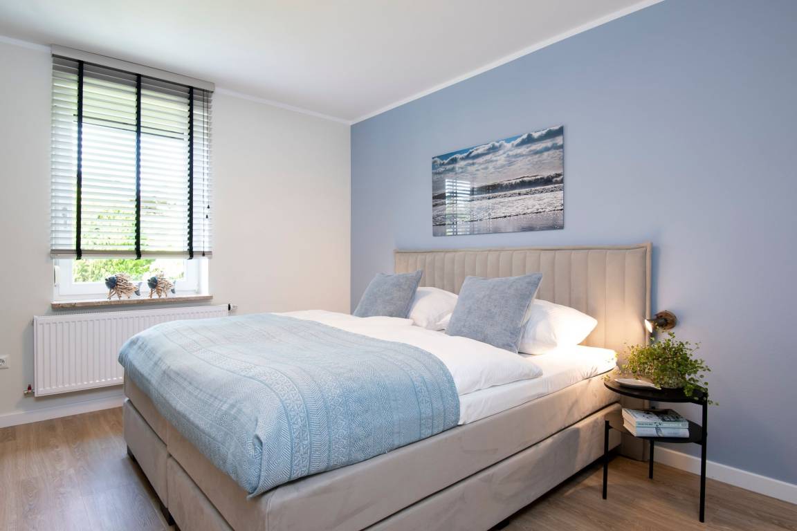 Schlafzimmer 1: 1 Boxspring-Doppelbett (2 x 90x200 cm, Topper 180x200 cm), Außenrollos