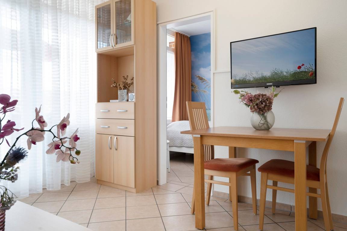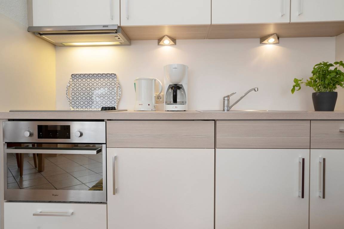 Gut durchdacht und liebevoll eingerichtet – die niedliche Ferienwohnung im Appartementhaus Im Sonnenwinkel bietet auf kleinem Raum alles, was das Urlaubs-Herz begehrt. Die schicke rote Couch und der Sessel laden zu gemütlichen Lese- oder auch TV-Stunden ein. Für die Nacht lässt sich die Couch bei Bedarf mühelos in ein Bett (ca. 2x 80x200 cm) verwandeln. Gleich nebenan haben Sie Zutritt auf den großzügigen Süd-Balkon. Genießen Sie hier den Sonnenschein und lassen Sie den Abend bei einem Glas Wein ausklingen. Die moderne Küchenzeile im Wohnbereich ist gut ausgestattet. Hier können Sie wunderbar Ihre Lieblingsspeisen zubereiten und anschließen in der Ess-Ecke Platz nehmen. Für die Nacht steht Ihnen ein Schlafzimmer mit einem Einzelbett (90x200 cm) zur Verfügung. Die schicke Foto-Tapete ist dabei ein echter Hingucker. Gleich nebenan befindet sich das moderne Duschbad, das einen guten Start in den Tag garantiert. Praktisch: Eine Waschmaschine und ein Trockner stehen Ihnen im Haus kostenfrei zur Verfügung.