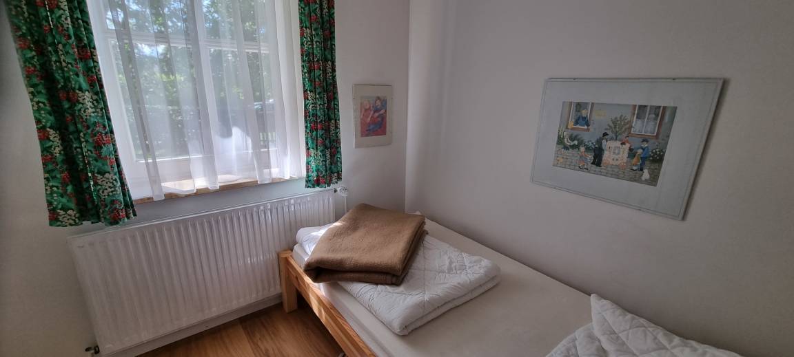 In dieser hellen, mit frischen Weiß- und Bunttönen eingerichteten Erdgeschosswohnung, werden Sie gern häufiger Urlaub machen wollen. Die weißen Sprossenfenster und das große Terrassentürelement, ebenfalls mit Sprossenscheiben, vermitteln eine anheimelnde Atmosphäre und geben den Blick frei in einen Obstbaumgarten mit großer Liegewiese. Dort können Sie ebenso Grillen wie auf der teilüberdachten zusätzlich mit Markise ausgestatteten großen Terrasse. Auf Wunsch stellen wir Ihnen eine Mikrowelle, Kinderbett und Hochstuhl unentgeltlich zur Verfügung. Waschmaschine und Trockner werden über einen Münzautomaten abgerechnet. Über WLAN haben Sie kostenlosen Internetzugang. Unseren Garten können Sie zum Spielen und Entspannen nutzen, Sandkasten und Schaukelgerät, Liegestühle und sonstige Gartenmöbel stehen Ihnen zur Verfügung.
