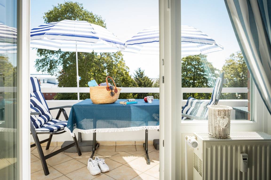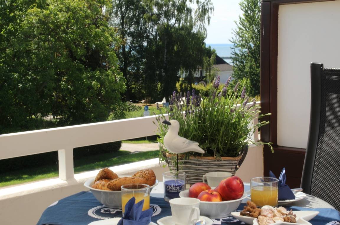 Vom Wohnzimmer aus betreten Sie den zur Ostsee ausgerichteten Balkon mit eingeschränktem Meerblick. Zusätzlich haben Sie die Möglichkeit, die Rasenfläche der Anlage zu nutzen.