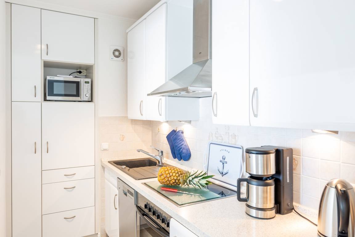 Die Einbauküche verfügt über einen Backofen, einen Herd mit Induktionskochfeld (neu April 2024), einen Geschirrspüler, einen Kühlschrank mit 3-Sterne-Gefrierfach, eine Mikrowelle, einen Toaster, einen Wasserkocher und eine Kaffeemaschine.