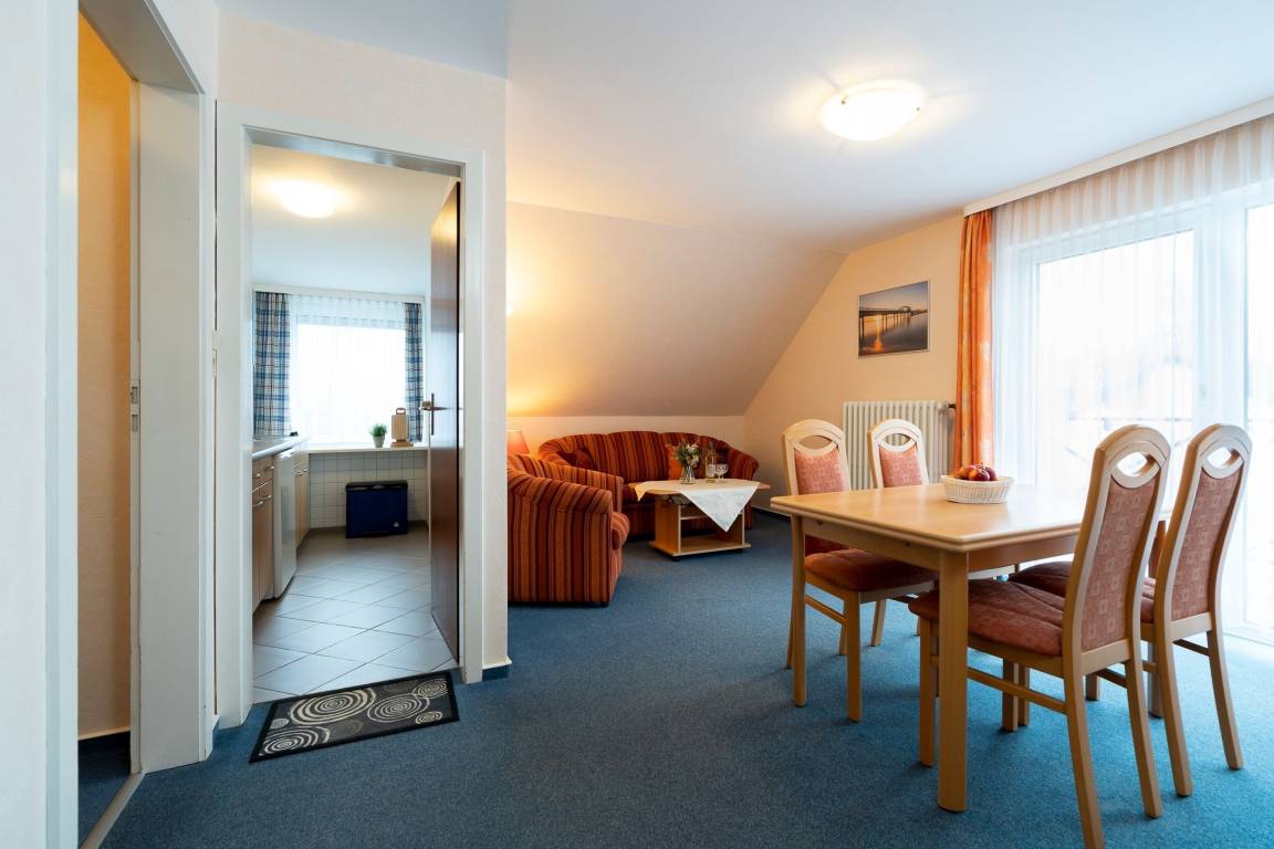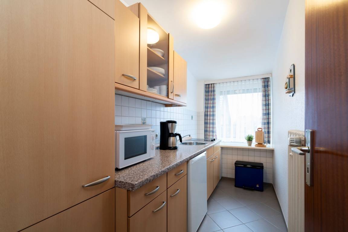 Nachdem Sie Ihren Urlaubsort erkundet haben können Sie im Wohn- und Essbereich entspannt die Füße hochlegen und bei einem guten Glas Wein und schmackhaften Köstlichkeiten am Esstisch den nächsten Tag planen. Natürlich können Sie sich auch mit einem spannenden Buch auf den möblierten Balkon zurückziehen und die Ruhe genießen. Im Gemeinschaftsgarten steht allen Gästen des Hauses darüber hinaus ein Kohlegrill zur Verfügung. Über einen kostenlosen WLAN-Anschluss streamen Sie Ihre Lieblingsmusik und bleiben mit Ihren Lieben in Verbindung. Beginnen Sie den Tag mit einem ausgiebigen Frühstück, dass Sie mühelos in der angrenzenden Küche zubereiten. Die Wohnung bietet 4 Schafmöglichkeiten. Im Wohnzimmer verwandeln Sie das Sofa mit nur wenigen Handgriffen in einen kuscheligen Rückzugsort für Nacht (ca. 150x200 cm). Nebenan lädt Sie das komfortable Doppelbett (2x 90x200 cm) zum Träumen ein. Für Ihre Urlaubsgarderobe finden Sie im Kleiderschrank ausreichend Platz zum Verstauen. Das Tageslichtbad mit Dusche und Spiegelschrank rundet die Ausstattung dieses Feriendomizils ab.