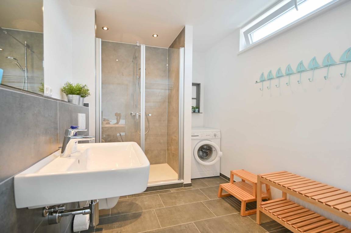 Badezimmer mit Dusche, Waschbecken, WC und Waschmaschine.