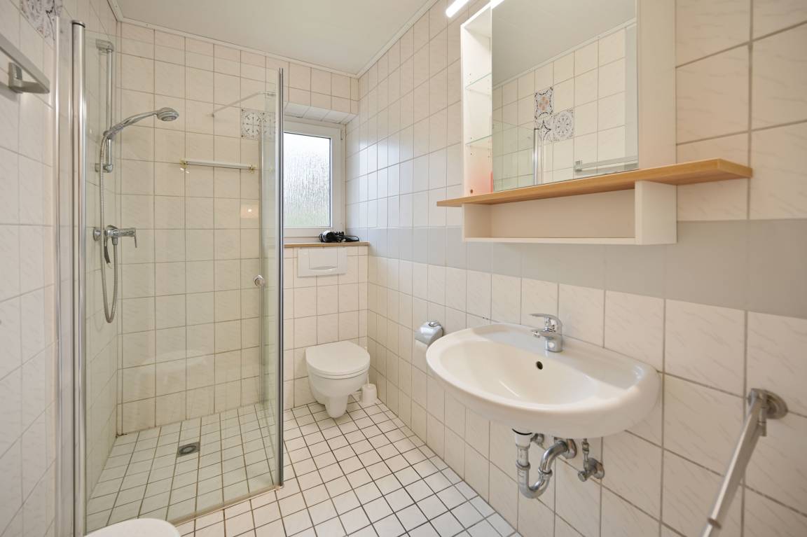 Das Badezimmer besteht aus einem WC, einem Waschbecken, einer Dusche, einem Spiegel, einem Fön, einem Hocker, mehreren Haken und einer Ablage.
