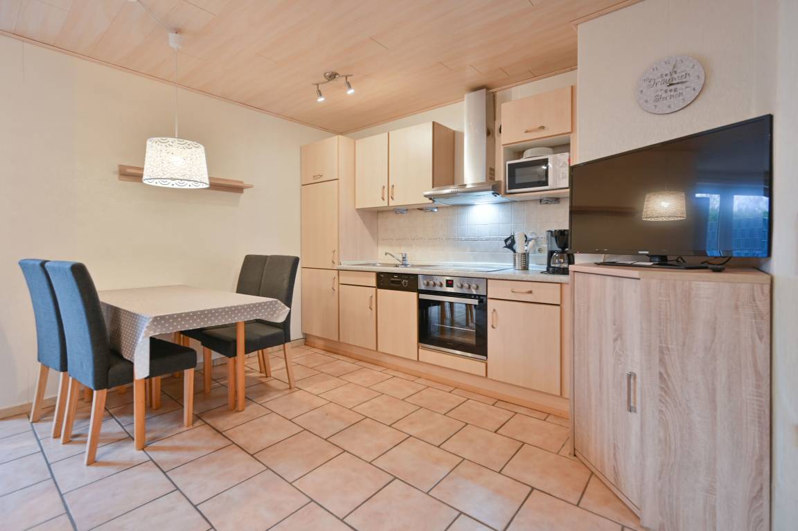 Zudem verfügt die Ferienwohnung über eine Küche mit Hochschränken, Kühlschrank, Gefrierfach, Spülmaschine, Backofen und Cerankochfeld. Des Weiteren befinden sich in der Küche eine Kaffeemaschine, ein Toaster, ein Wasserkocher, eine Mikrowelle und die übliche Grundausstattung für 4 Personen.
