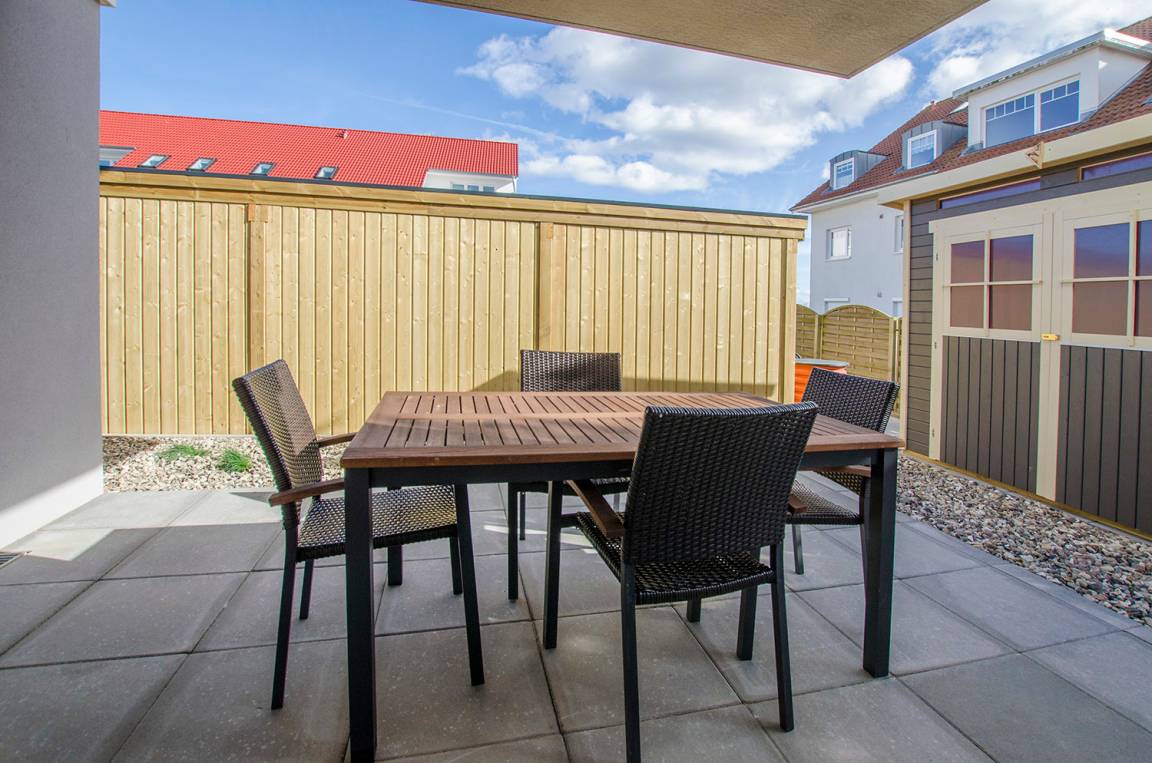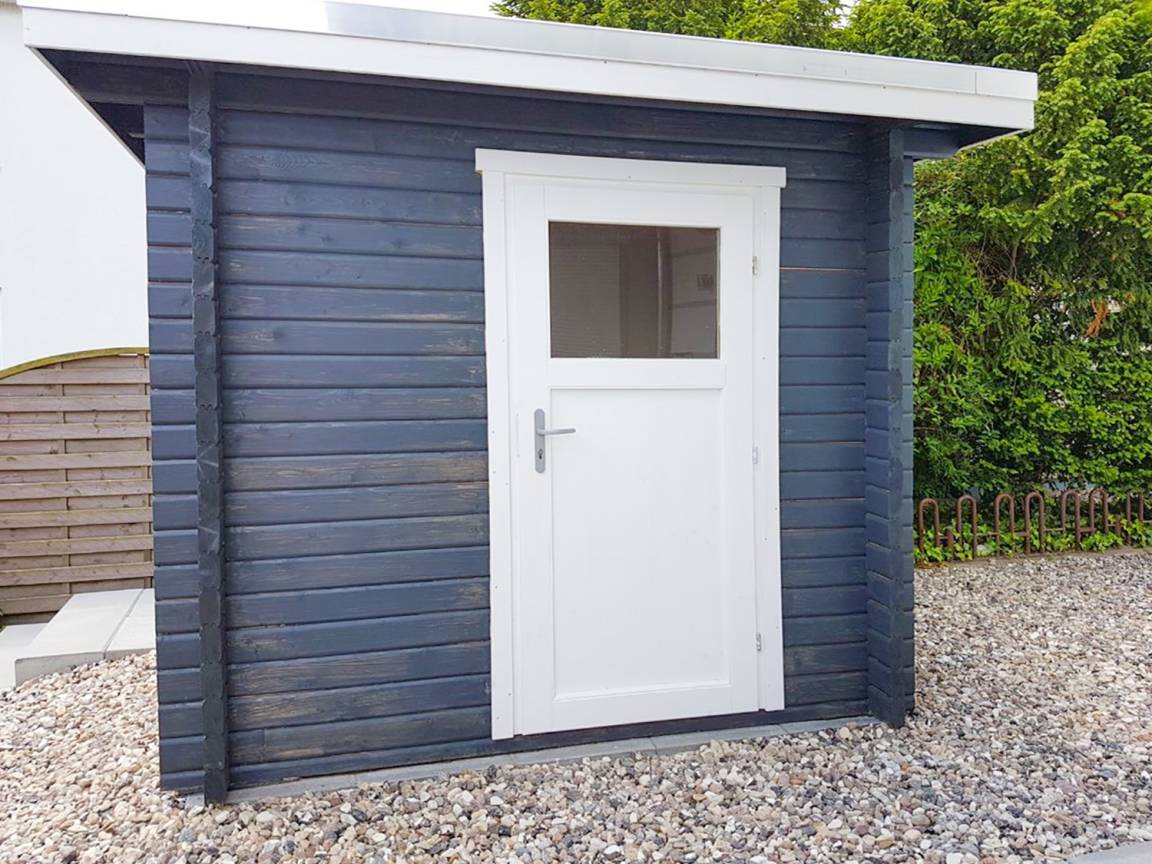 Vom Wohnbereich haben Sie Zugang zur überdachten Terrasse mit Gartentisch und Stühlen. Hier befindet sich das kleine Saunahäuschen.