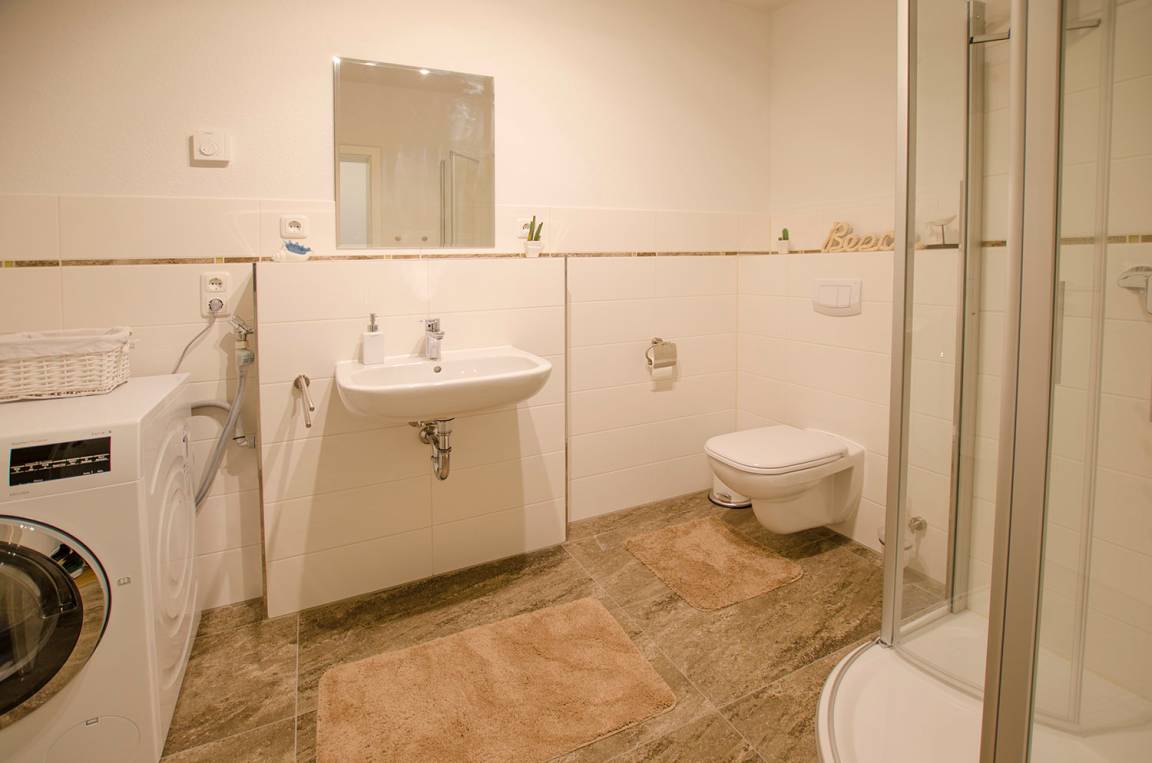 Das Badezimmer ist mit ebenerdiger Dusche ausgestattet und verfügt über eine Waschmaschine.