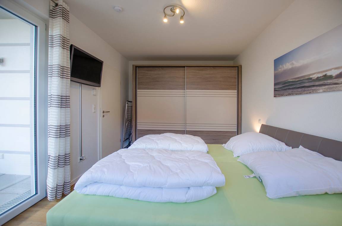 Das separate Schlafzimmer ist mit Doppelbett, Nachttischen, Leseleuchten und großem Kleiderschrank eingerichtet. Hier ist ein zweiter Flachbild-TV für Sie an der Wand montiert. Auch vom Schlafzimmer haben Sie Zugang zur Terrasse.