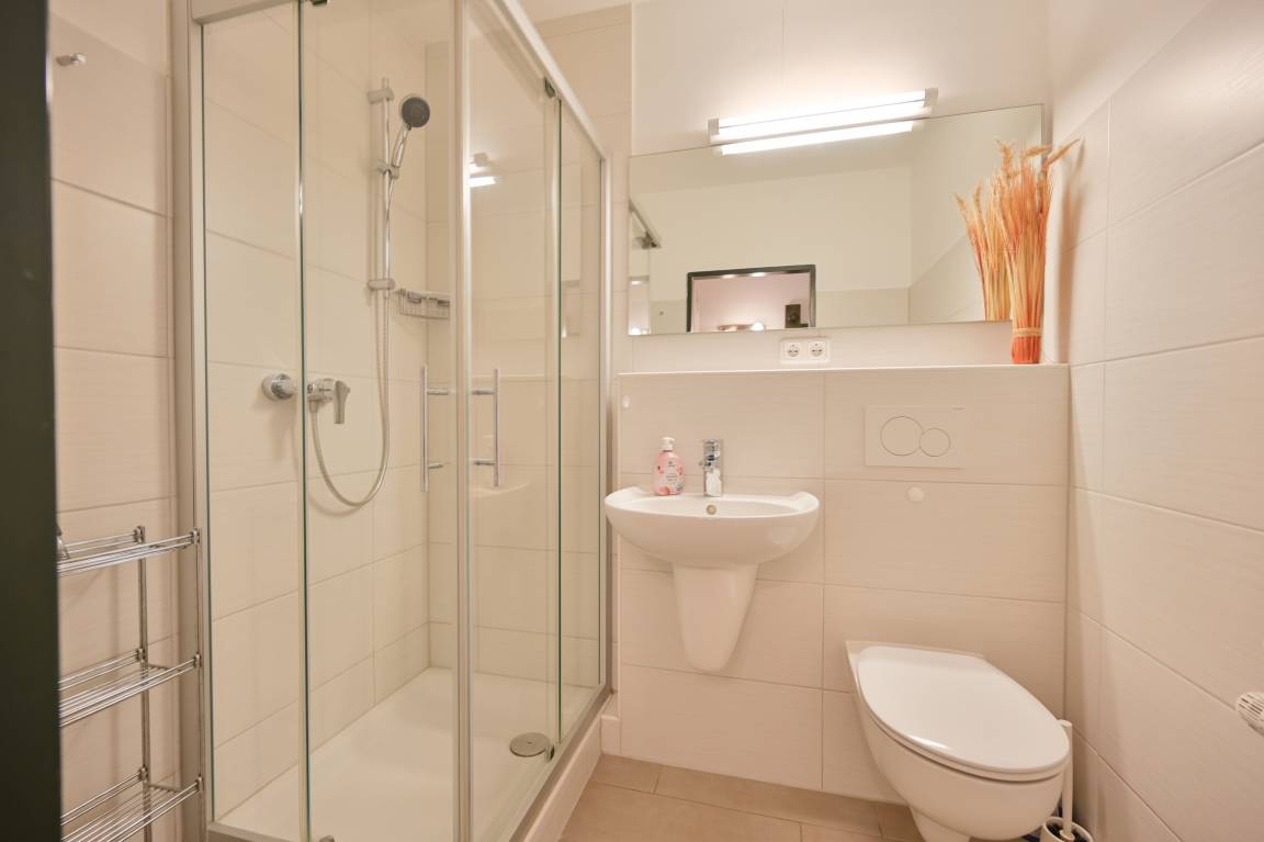 Das moderne Badezimmer ist mit Dusche und WC ausgestattet. Ein einladender Flur