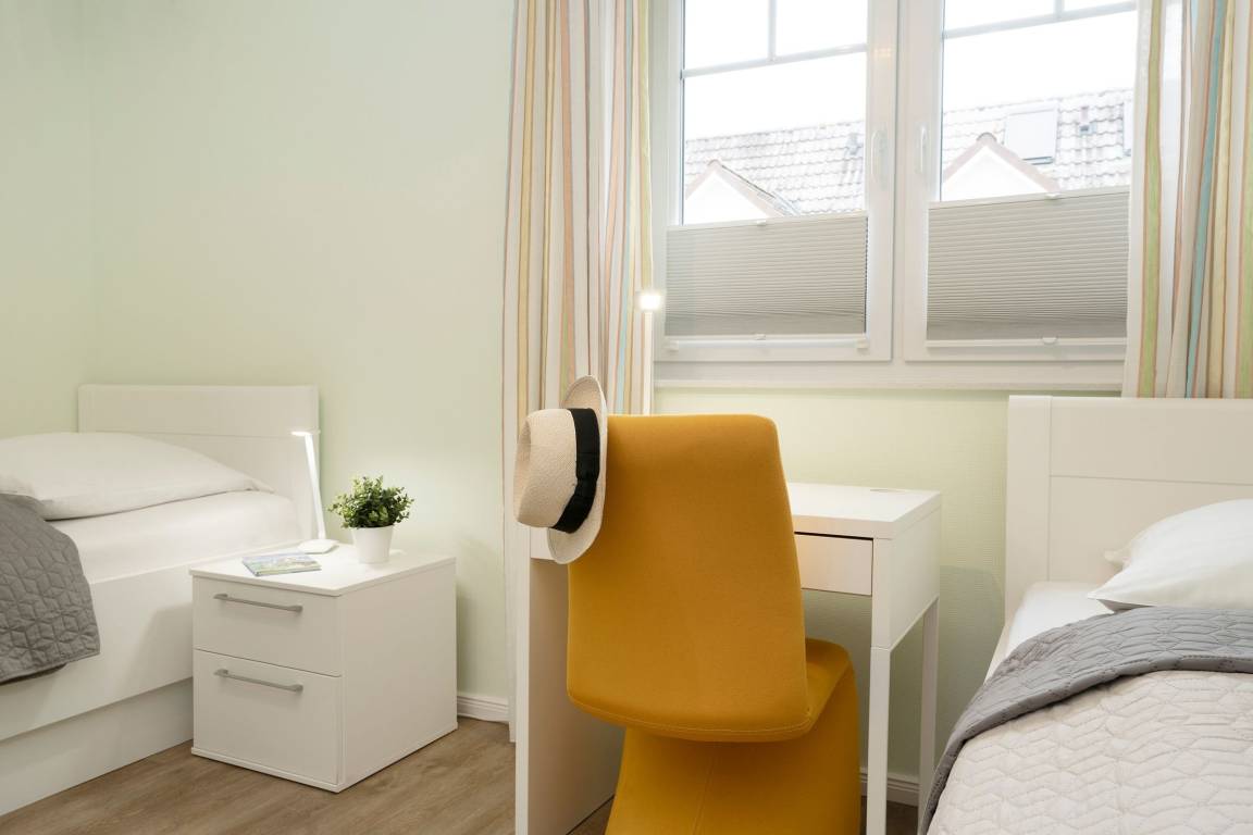 Schlafzimmer 2: 2 Einzelbetten (2x 90x200 cm), Verdunkelung (Plissees, Außenjalousien), verstellbare Lattenroste (Kopf- + Fußteil), TV