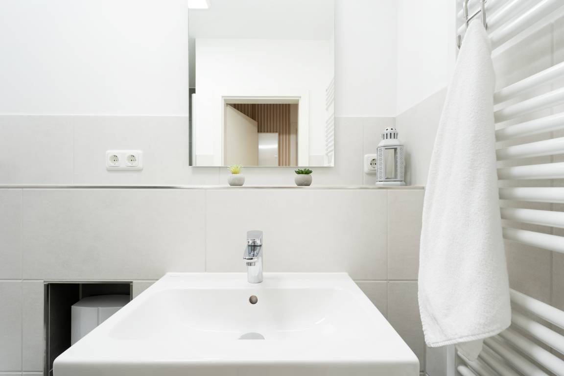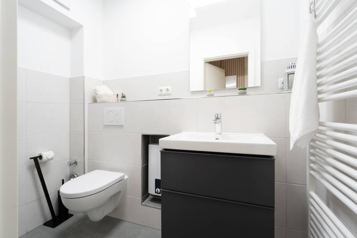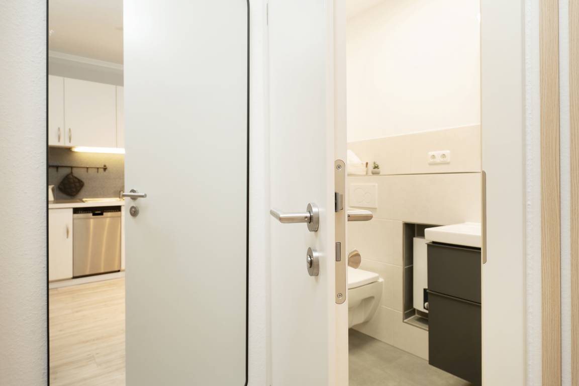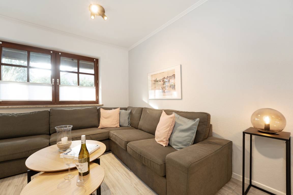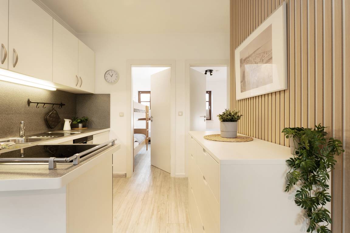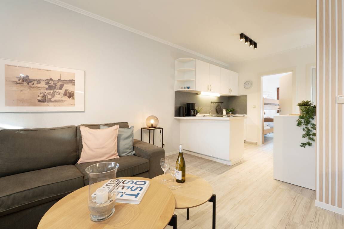 Sie suchen Ruhe und Erholung? Dann sind Sie hier genau richtig. Die schöne Ferienwohnung besticht durch ihre gemütliche und durchdachte Aufteilung im Wohnbereich: Sie haben die Wahl zwischen einer großen, kuscheligen Sofalandschaft und einer stylischen Essecke. Ein TV-Gerät sorgt für Unterhaltung. Auf der möblierten Süd-Terrasse können Sie Ihre wohl verdiente Auszeit bei Sonnenschein genießen. Zurück im Wohnbereich: Die offene, moderne Küche mit Spülmaschine und heller Front bietet alles, was Sie für eine Selbstversorgung im Urlaub brauchen. Wunderbar schlafen werden Sie sicherlich in den beiden Schlafzimmern: Ein Raum ist mit einem Doppelbett (180x200 cm) und einem Kleiderschrank ausgestattet. In dem anderen Raum befinden sich ein Etagenbett (je 90x200 cm), ein einzelnes Kinderbett (90x170 cm) und ein Kleiderschrank. Das schicke, komfortable Duschbad mit Handtuchwärmer garantiert einen guten Start in den den neuen Urlaubstag.