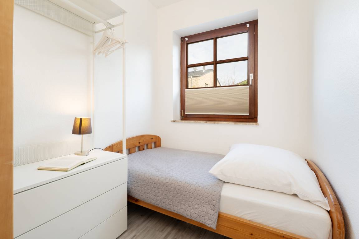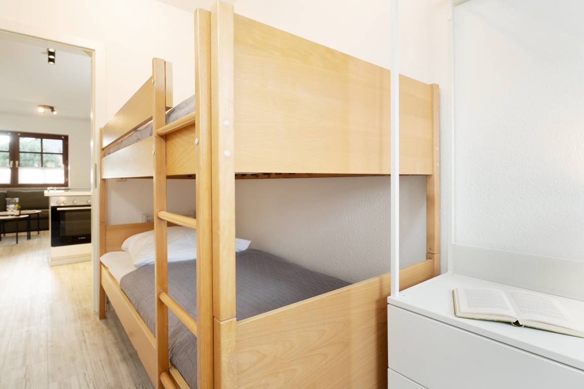 Schlafzimmer 2: 1 Etagenbett (2x 90x200cm), 1 Einzelbett (90x170cm), Kleiderschrank, Verdunkelung (Rollo)