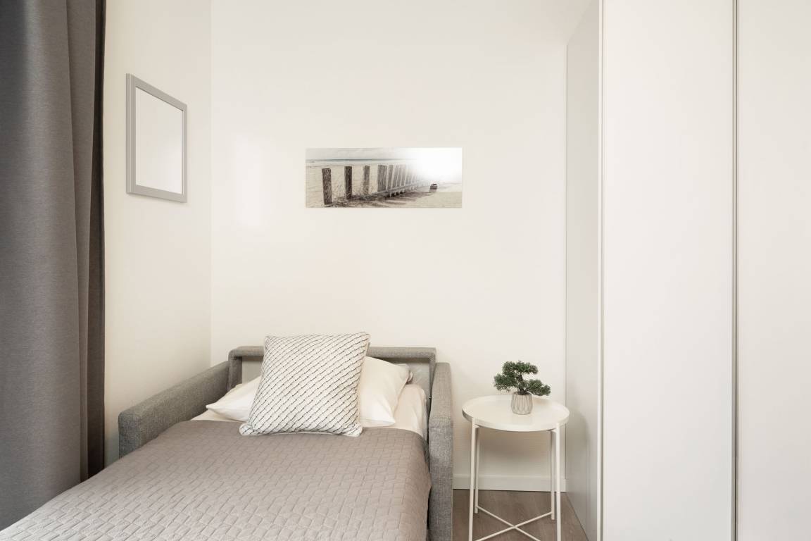 Schlafzimmer 1: 1 Boxspringbett (180x200 cm), 1 Schlafsofa, TV, Kleiderschrank, Verdunkelungsmöglichkeit