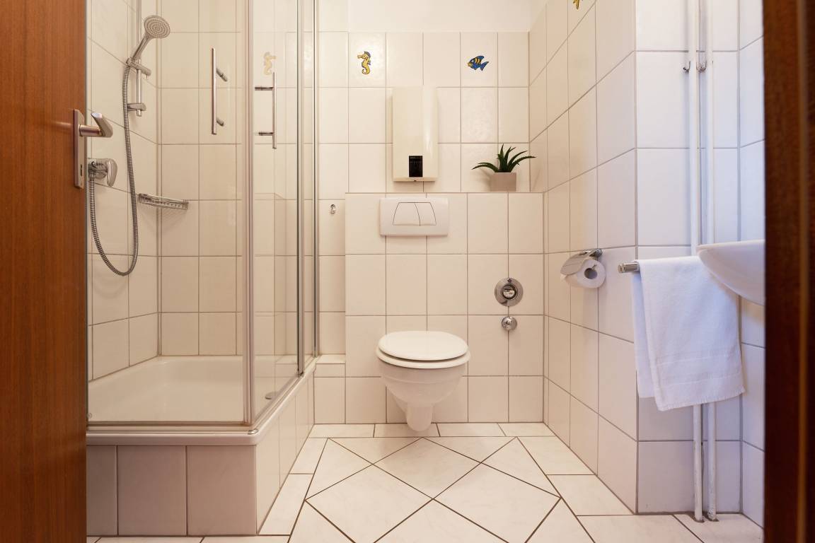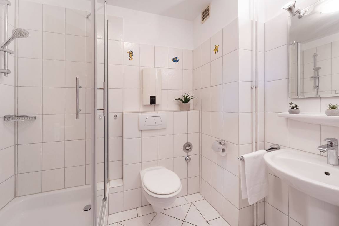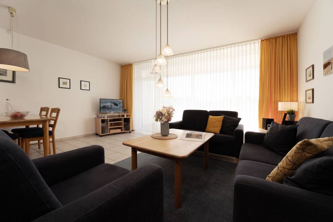 Treten Sie ein in diese gemütliche Ferienwohnung deren Herzstück das offene Wohnzimmer bildet. Die großzügige Sofaecke lädt nach einem ereignisreichen Urlaubstag zum Füße hochlegen ein und für Unterhaltung sorgen ein TV, DVD-Player sowie ein Radio. Von hier aus gelangen Sie auf den schönen großen Balkon in südlicher Lage, auf dem Sie die letzten Sonnenstrahlen des Tages genießen können. Durch die Schrankwand mit ausklappbaren Betten (ca. 180x200 cm) lässt sich dieser Raum im Handumdrehen in einen komfortablen Schlafplatz für zwei Urlaubsgäste verwandeln. In der hellen Küche mit 4-Platten-Herd (Backofen), Geschirrspüler, Kaffeemaschine, Toaster, Mikrowelle etc. können Sie sich wohlschmeckende Mahlzeiten zubereiten. Über den Flur gelangen Sie in das separate Schlafzimmer mit zwei getrennte Einzelbetten (je 90x200 cm). Abgerundet wird diese Wohnung durch das funktionale Badezimmer mit Dusche und WC.