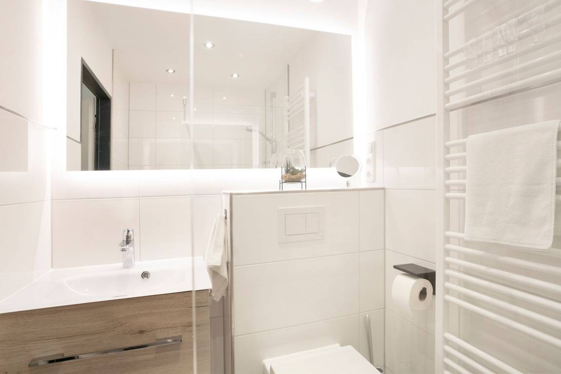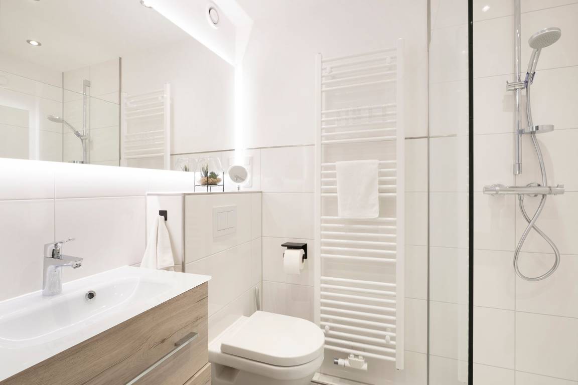 Der Fahrstuhl bringt Sie bequem in die 4. Etage der Appartementanlage. Hell und freundlich begrüßt Sie der maritim gestaltete Wohnbereich, der die ganze Familie zum Essen, Spielen und zu kuscheligen Stunden auf dem Sofa einlädt. Von hier aus gelangen Sie auf den möblierten Balkon mit seitlichem Meerblick. An der frischen Ostseeluft können Sie sicher schnell vom Alltag abschalten. Zum Schlafen steht Ihnen, abgetrennt durch einen Vorhang, ein Doppelbett (180x200 cm) zur Verfügung. Gleich nebenan befindet sich ein separates Schlafzimmer mit Etagenbett (je 90x200 cm) und Kleiderschrank. Die gepflegte Küche ist gut ausgestattet, um sich mühelos selbst zu verpflegen. Das moderne Bad bietet eine großzügige Dusche und viel Stauraum.
