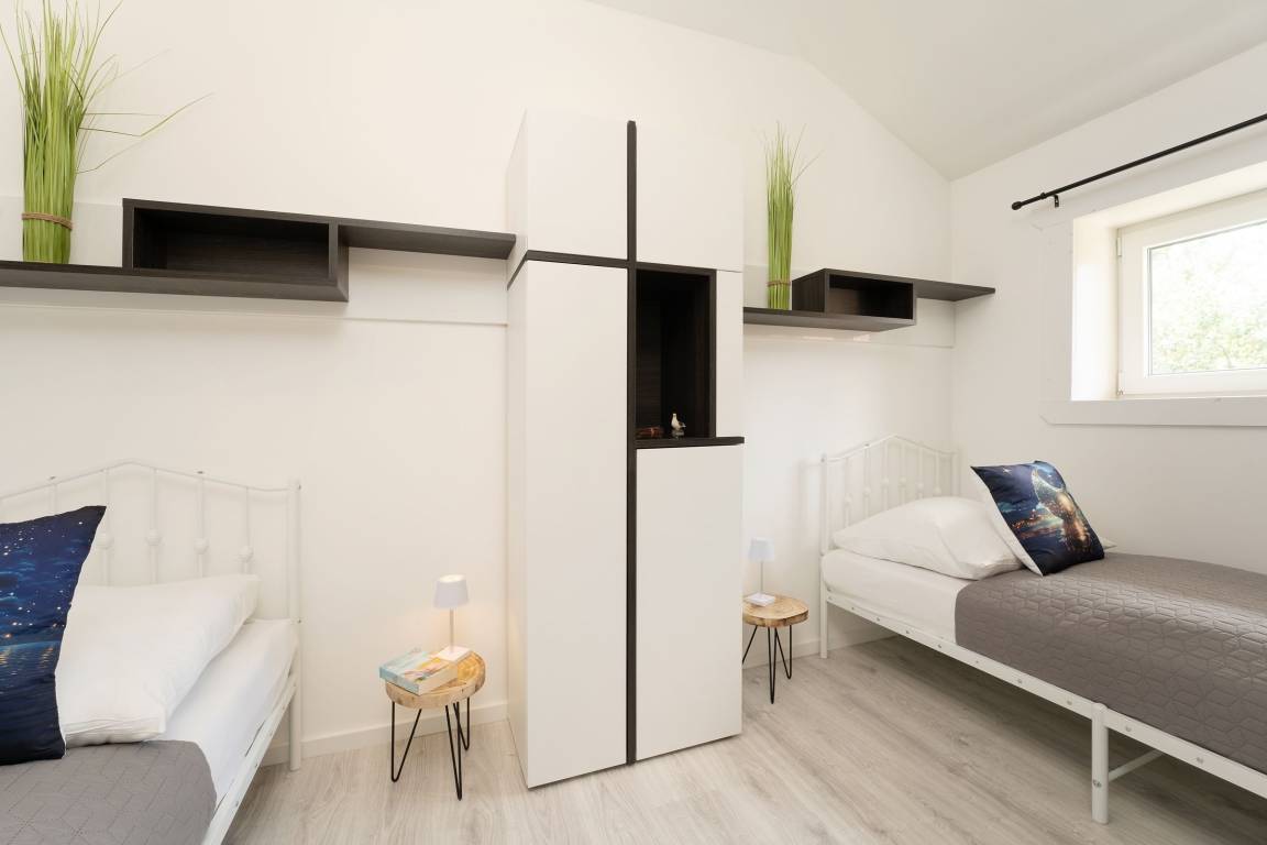 Schlafzimmer 2 (1.OG): 2 Einzelbetten (je 80x200 cm), Kleiderschrank, Verdunkelung: Vorhänge, Platz für Babybett vorhanden