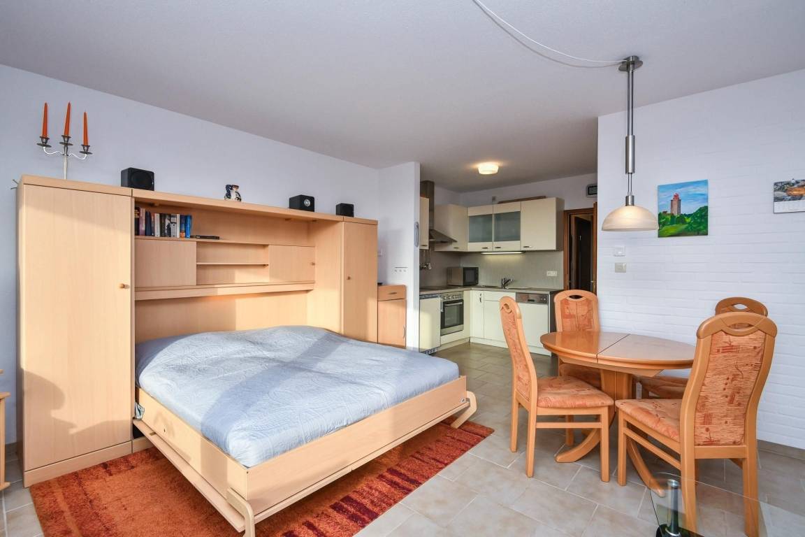 Das schöne Ferienapartment befindet sich in der Wohnanlage Haus Sol Mare in der 3. Etage (ohne Fahrstuhl) – und heißt Sie herzlich willkommen! Genießen Sie Ihre Auszeit im gemütlichen Wohn-/Schlafbereich, für Unterhaltung sorgen dabei ein TV-Gerät sowie ein Blu-ray- und ein CD-Spieler. Oder entspannen Sie bei gutem Wetter auf dem möblierten Süd-Balkon. Die offene Küche mit Geschirrspüler ermöglicht eine angenehme Selbstversorgung. Nach einem schönen Tag am Strand – die Ostsee ist nur rund 200 Meter entfernt – lässt sich das bequeme Schrank-Doppelbett (2x 90x200 cm) ausklappen. Zudem stehen Ihnen 2 Einzelbetten (je 90x200 cm) im separaten Schlafzimmer zur Verfügung. Das Duschbad ist hell gefliest.