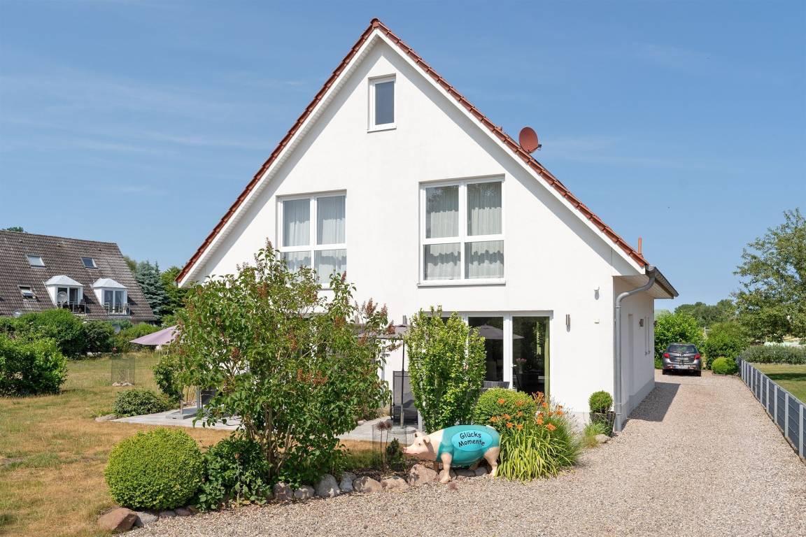 Hier können Sie glücklich sein – die schicke Ferienunterkunft im Bungalowstil befindet sich im Haus Glücksmomente und sorgt mit Sicherheit für wahre Hochgefühle im Urlaub. Der Wohnbereich besticht durch eine liebevoll ausgesuchte Einrichtung. Es lassen sich viele maritime Details finden, aber auch die Nähe zum Wald wird in der Dekoration deutlich. Wald und Meer – eine wunderbare Kombination. Nehmen Sie auf dem schicken Dreisitzer oder auf dem Relaxsessel mit Hocker Platz und lassen Sie sich vom TV-Gerät unterhalten. Auch vor der großen Terrassentür befindet sich eine schöne Sitz-Ecke zum Verweilen. Genießen Sie hier Ihre Urlaubs-Menüs oder planen Sie hier Ihre Ausflüge. Die Ostseeküste hat viel zu bieten. Direkt hier können Sie auch raus auf die möblierte Süd-Terrasse treten und es sich auf der Sonnenliege gemütlich machen. Oder wie wäre es hier abends mit einem Glas Wein? Auch befindet sich hier ein Gemeinschaftsgrill, den Sie gern nutzen können. Zurück im Wohnraum präsentiert sich die offene Küche mit Spülmaschine in einer Nische, sodass sie doch etwas abgetrennt wirkt. Die gute Ausstattung lässt sicher keine Wünsche offen. Nach einem erlebnisreichen Urlaubstag kommen Sie in den beiden Schlafräumen wunderbar zur Ruhe. Ein Zimmer verfügt über ein französisches Bett (140x200 cm) und ein Zimmer über 2 Einzelbetten (je 90x200 cm). Das moderne, helle Duschbad mit Fenster verspricht einen guten Start in den Tag. Angenehme Wärme verschafft die Fußbodenheizung in Badezimmer und Wohnbereich.