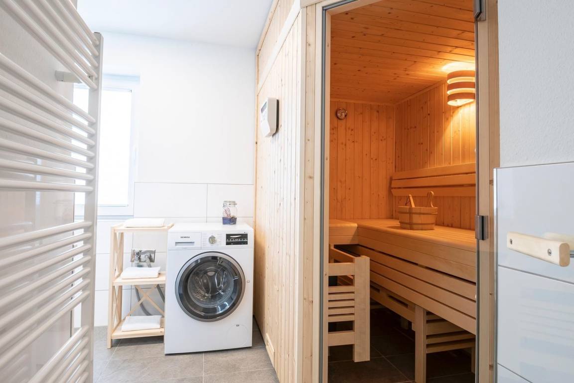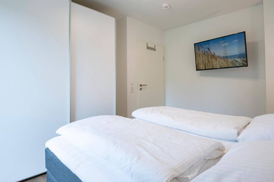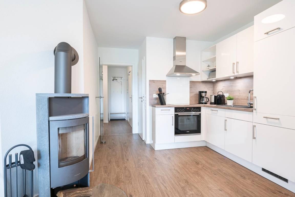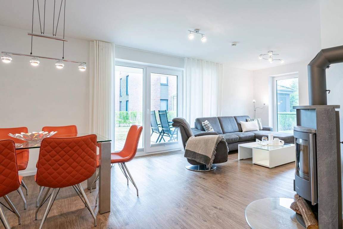 Herzlich willkommen – in dieser komfortablen Wohnung werden Sie sich sofort wohlfühlen. Hier treffen großzügige Räumlichkeiten auf guten Geschmack. Der lichtdurchflutete Wohnbereich begrüßt Sie mit einer kuscheligen Sofalandschaft. Entspannen Sie hier vor dem TV-Gerät mit DVD-Player oder lauschen Sie an kühleren Tagen dem Feuer im Kaminofen. Direkt hinter der Couch können Sie die großzügige, überdachte Terrasse mit Süd-Ausrichtung betreten. Genießen Sie Ihre Auszeit im gemütlichen Strandkorb oder nehmen Sie in der Sitzecke Platz. Wie wäre es mit einem guten Buch? Die zum Wohnraum hin offen gestaltete, moderne Küche verfügt über nette Annehmlichkeiten wie einer Nespresso-Maschine sowie einem Geschirrspüler. Ihre Speisen können Sie in der schicken Essecke zu sich nehmen. Für die Nacht stehen Ihnen zwei Schlafräume zur Verfügung: Ein Zimmer ist mit einem Boxspringbett (180x200 cm) sowie einem zusätzlichen TV-Gerät ausgestattet. In dem anderen Zimmer steht ein Etagenbett (je 90x200 cm). Das großzügige, tageslichthelle Duschbad mit Sauna bietet auch an kälteren Tagen Wärme und Entspannung .