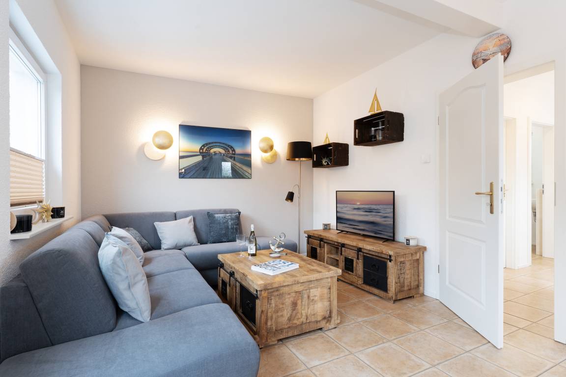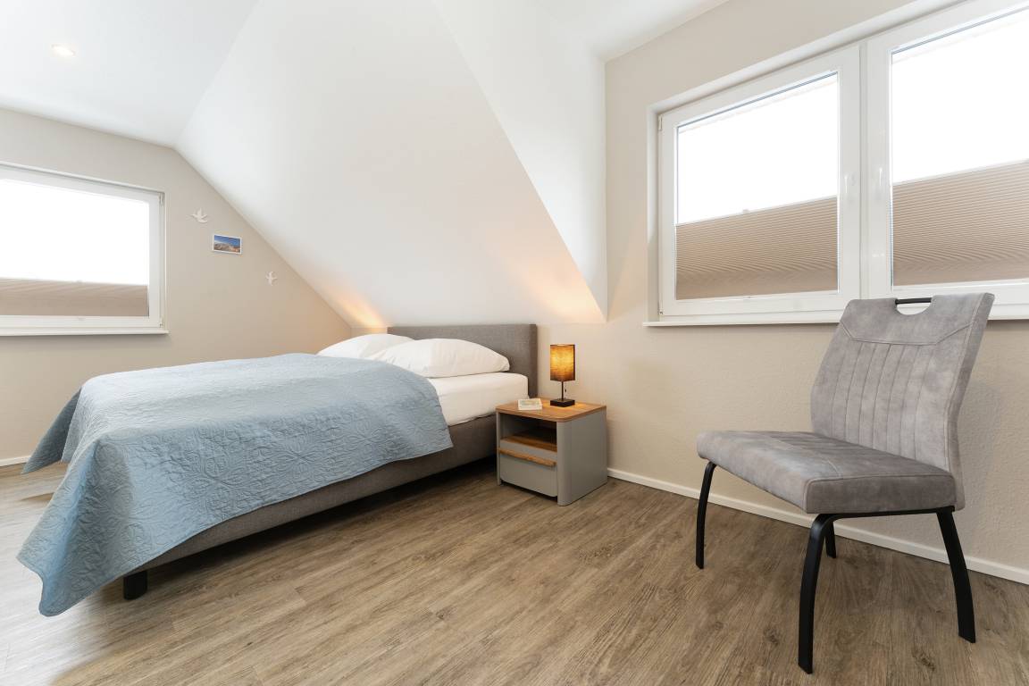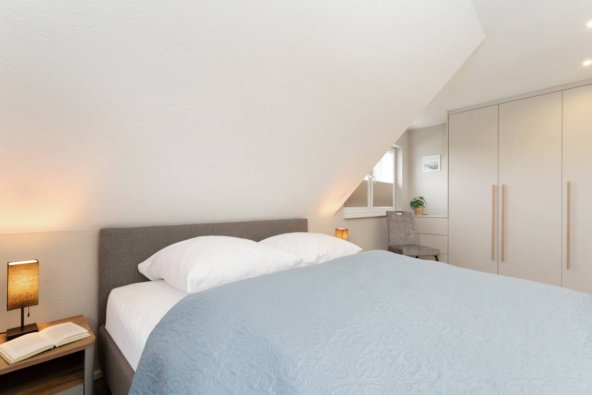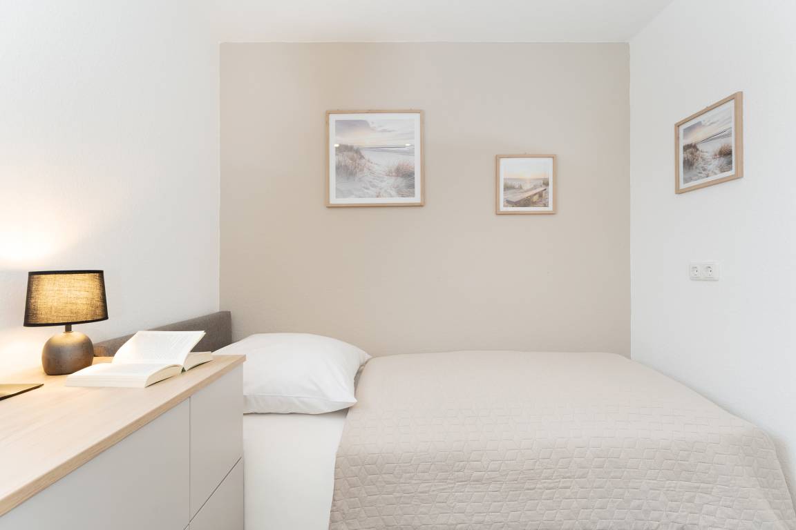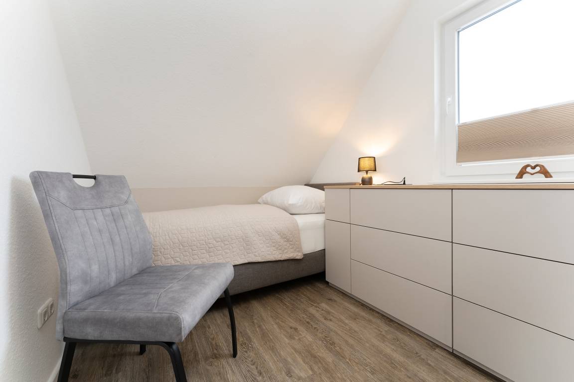 Zwei separate Schlafzimmer sorgen für erholsamen Schlaf. Schlafzimmer 1 bietet ein komfortables Boxspring-Doppelbett (2 × 90 × 200 cm), einen großen Kleiderschrank mit integrierter Kommode, TV sowie Platz für ein Babybett. Schlafzimmer 2 ist mit zwei Boxspring-Einzelbetten (je 90 × 200 cm) und einer großen Kommode ausgestattet. Im Wohnbereich steht zusätzlich eine hochwertiges Schlafsofa (120 × 200 cm) bereit.