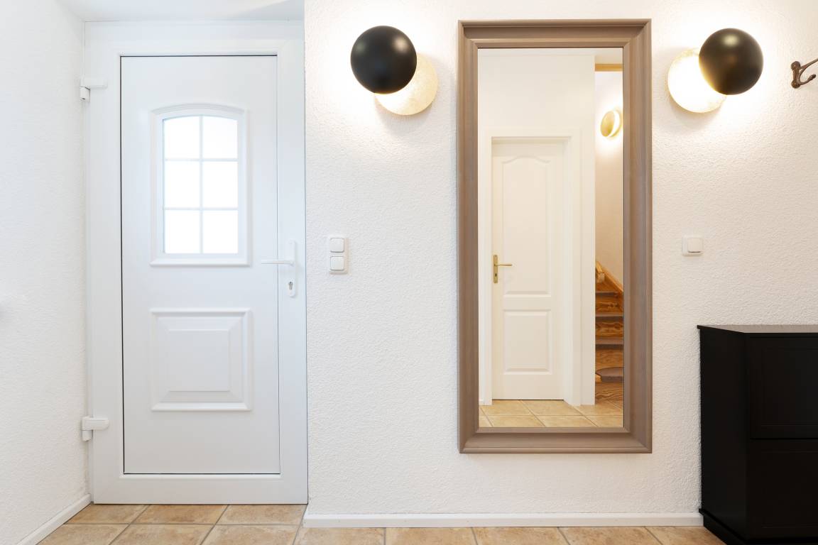 Das moderne Badezimmer verfügt über eine bodengleiche Dusche, WC, Waschbecken, Handtuchheizkörper, Fußbodenheizung und Föhn. Ergänzend stehen ein Gäste-WC im Erdgeschoss, WLAN, Fußbodenheizung im gesamten Haus, Waschmaschine, Fahrradabstellplatz sowie ein reservierter PKW-Außenstellplatz zur Verfügung.