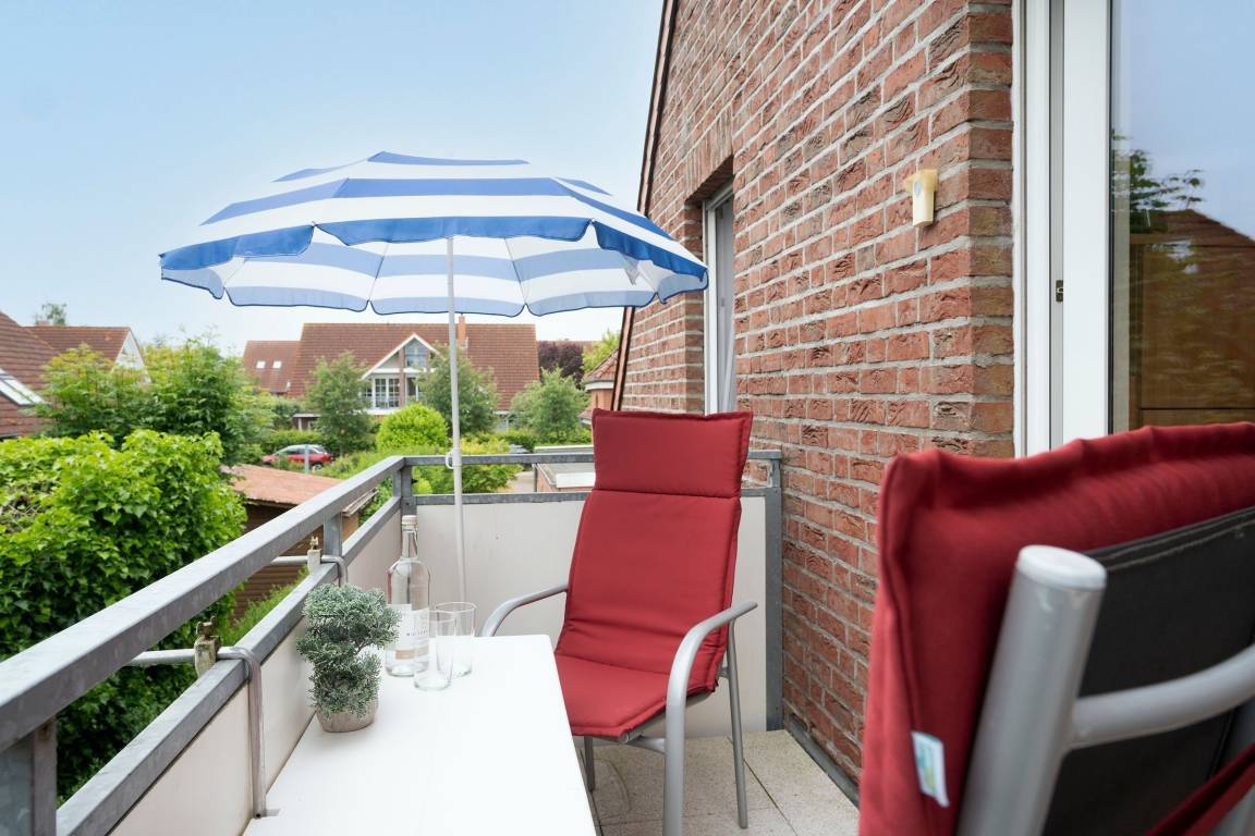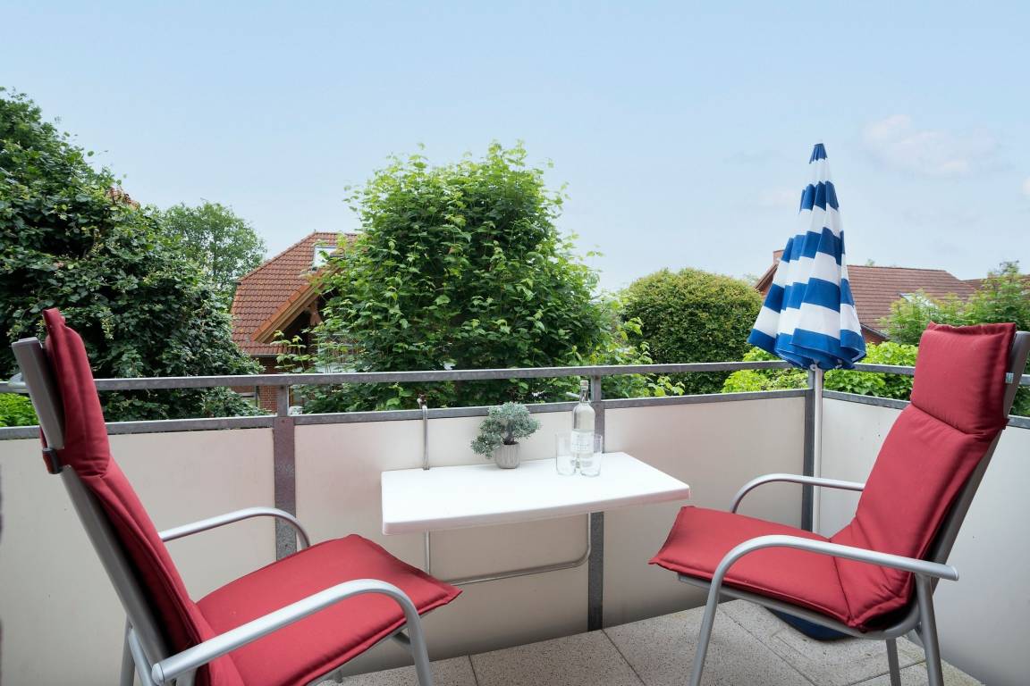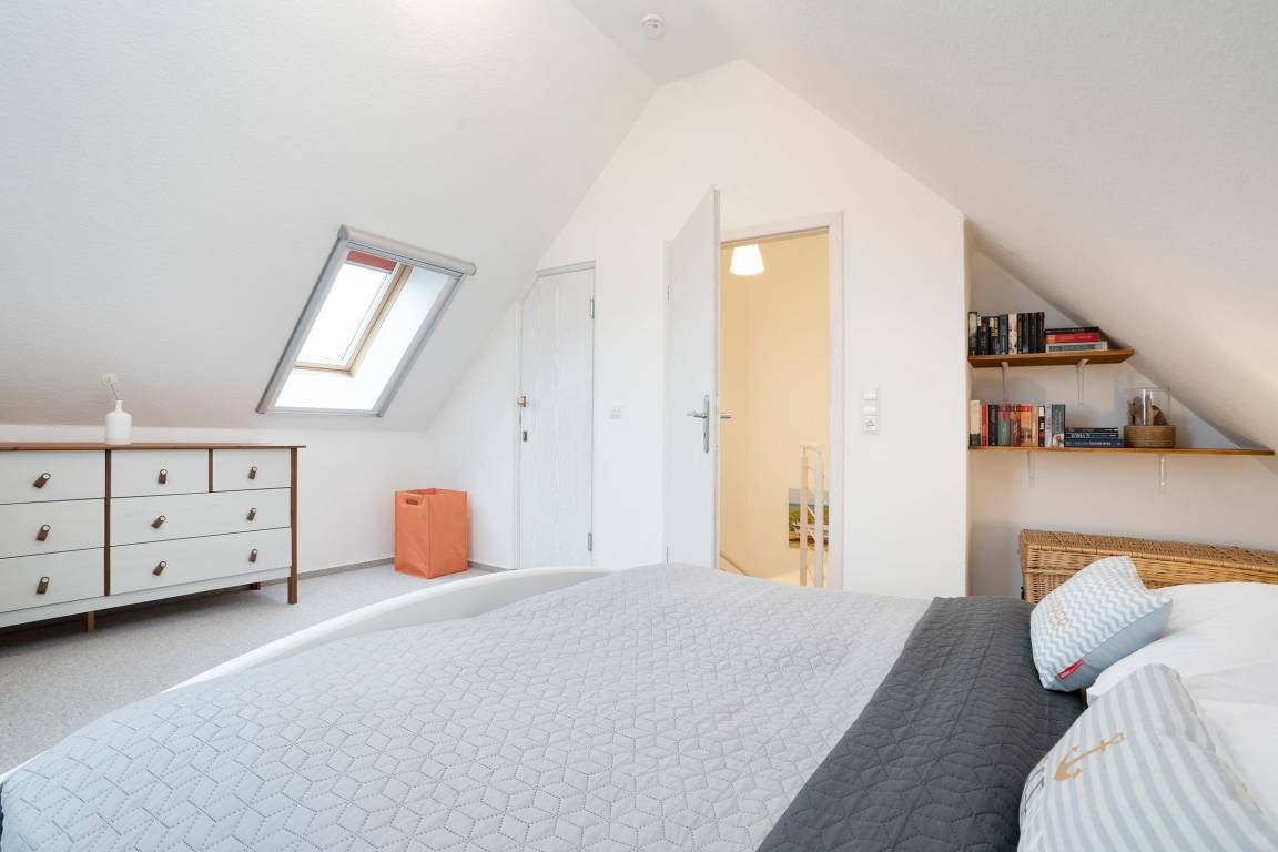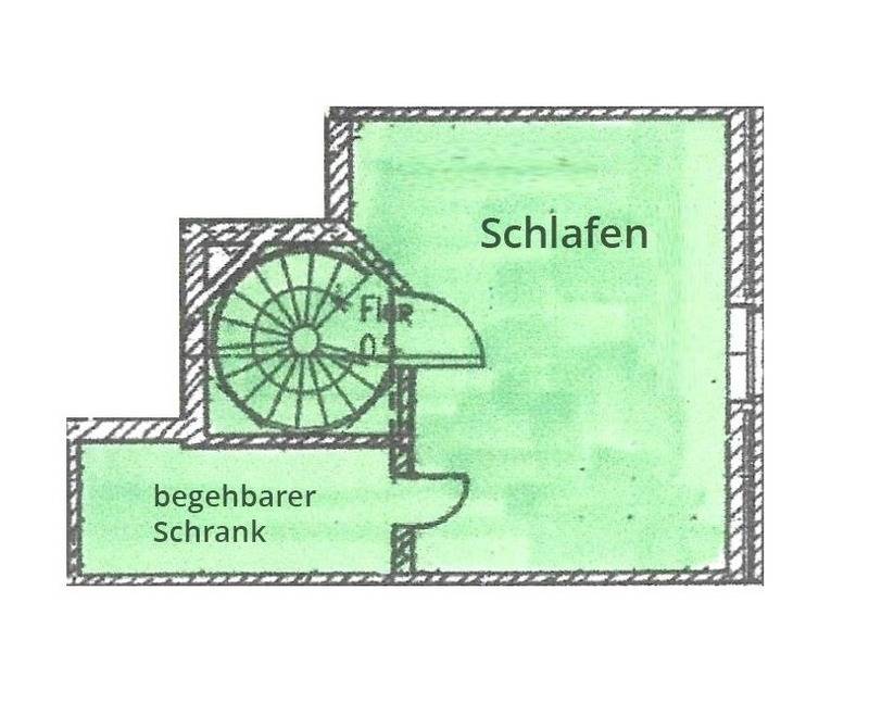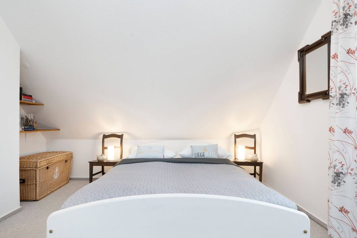 Im ersten Obergeschoss des Hauses empfängt Sie diese Ferienwohnung mit einem gemütlichem Wohnzimmer und voll ausgestatteter Küche, die keine Wünsche offen lässt. Auf dieser Etage befinden sich auch das erste Schlafzimmer mit gemütlichem Doppelbett (2x 80x200 cm), praktischem Kleiderschrank und Rollläden für die Nachtruhe, sowie das Vollbad für einen entspannten Start in den Tag. Folgen Sie der Wendeltreppe in das zweite Obergeschoss und entdecken Sie Schlafzimmer Nr. 2 mit einem Doppelbett (2x 90x200 cm), Kleiderschrank und genug Platz für ein Kinderreisebett. Auch diesen Raum können Sie für die nächtliche Erholung mittels Rollläden und Gardinen abdunkeln. Wer sich nach Tageslicht sehnt, wird auf dem möblierten Balkon mit Nord-Ost-Ausrichtung fündig.