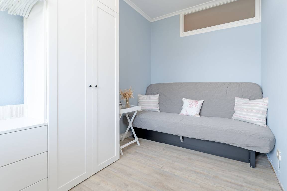 Schlafzimmer: 1 Schlafsofa (140x200 cm), Kleiderschrank, Verdunkelung: Rollo, Platz für Babybett vorhanden
