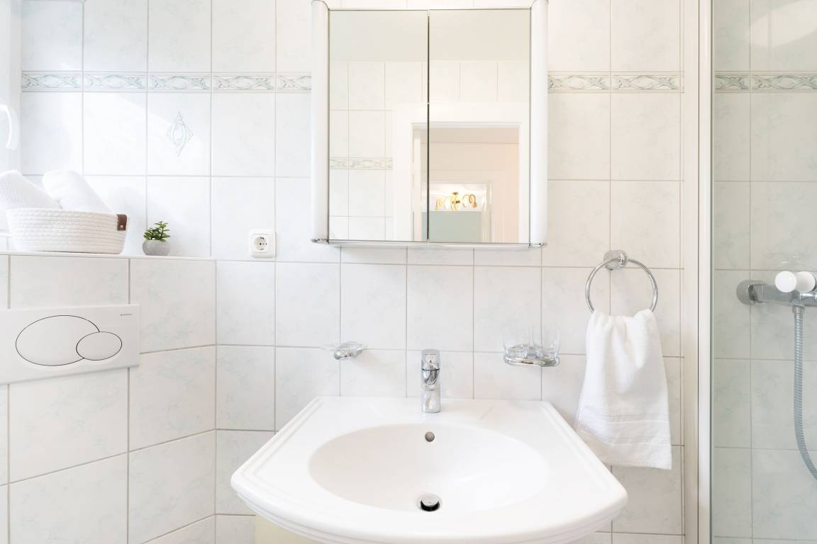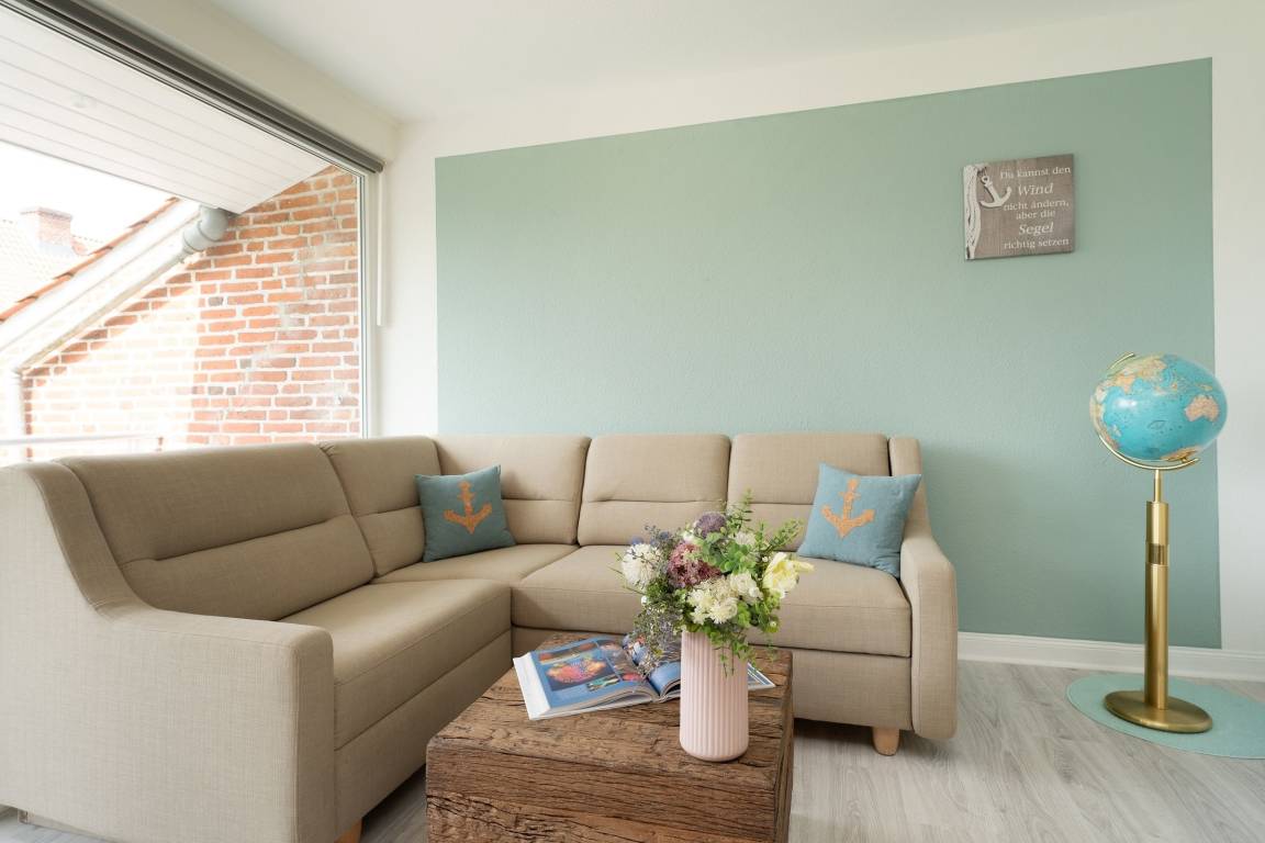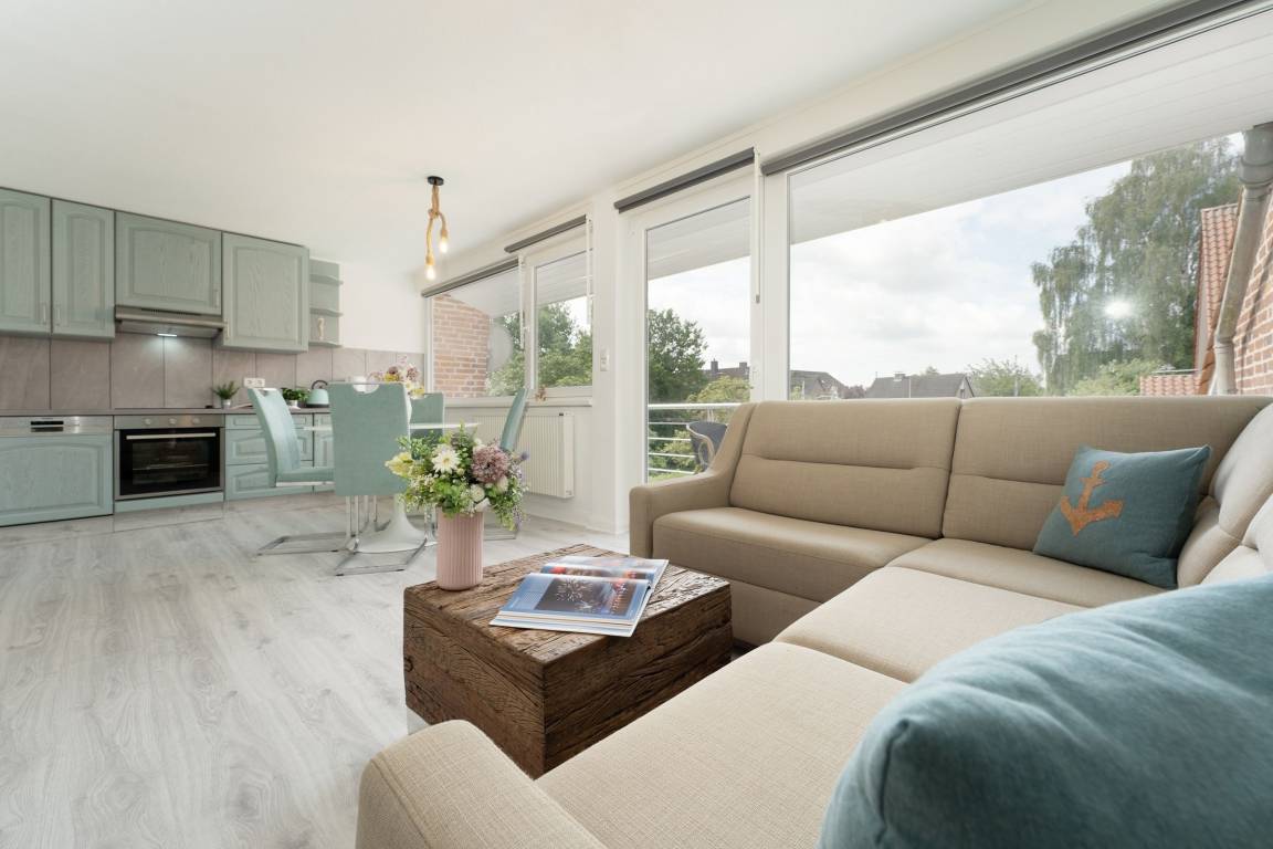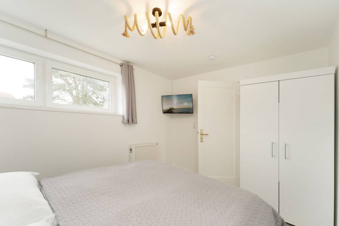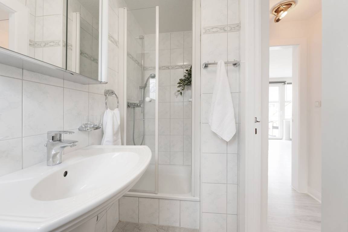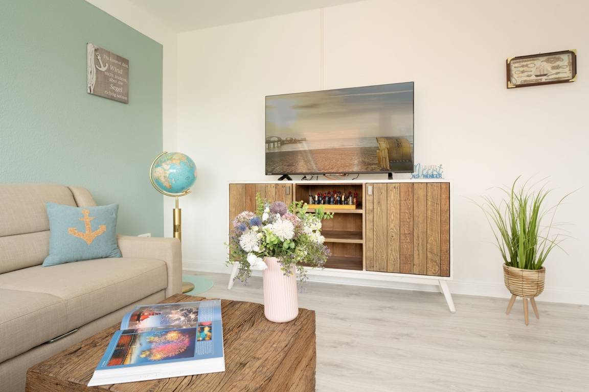 Im offenen Wohn- und Essbereich mit angrenzender Küchenzeile finden Sie ausreichend Platz zum gemütlichen Beisammensein. Die Couch lässt sich bei Bedarf in eine Schlafmöglichkeit (ca. 160x200 cm) verwandeln. Vom Wohnbereich aus gelangen Sie auf den überdachten Südwest-Balkon. Hier können Sie ausgiebige Sonnenstunden genießen und die Seele baumeln lassen. Das separate Schlafzimmer mit Doppelbett (2x 80x200 cm), Kleiderschrank und einem TV lässt Sie erholsame Nächte verbringen. Das gegenüberliegende Badezimmer mit Fenster ist hell gefliest.