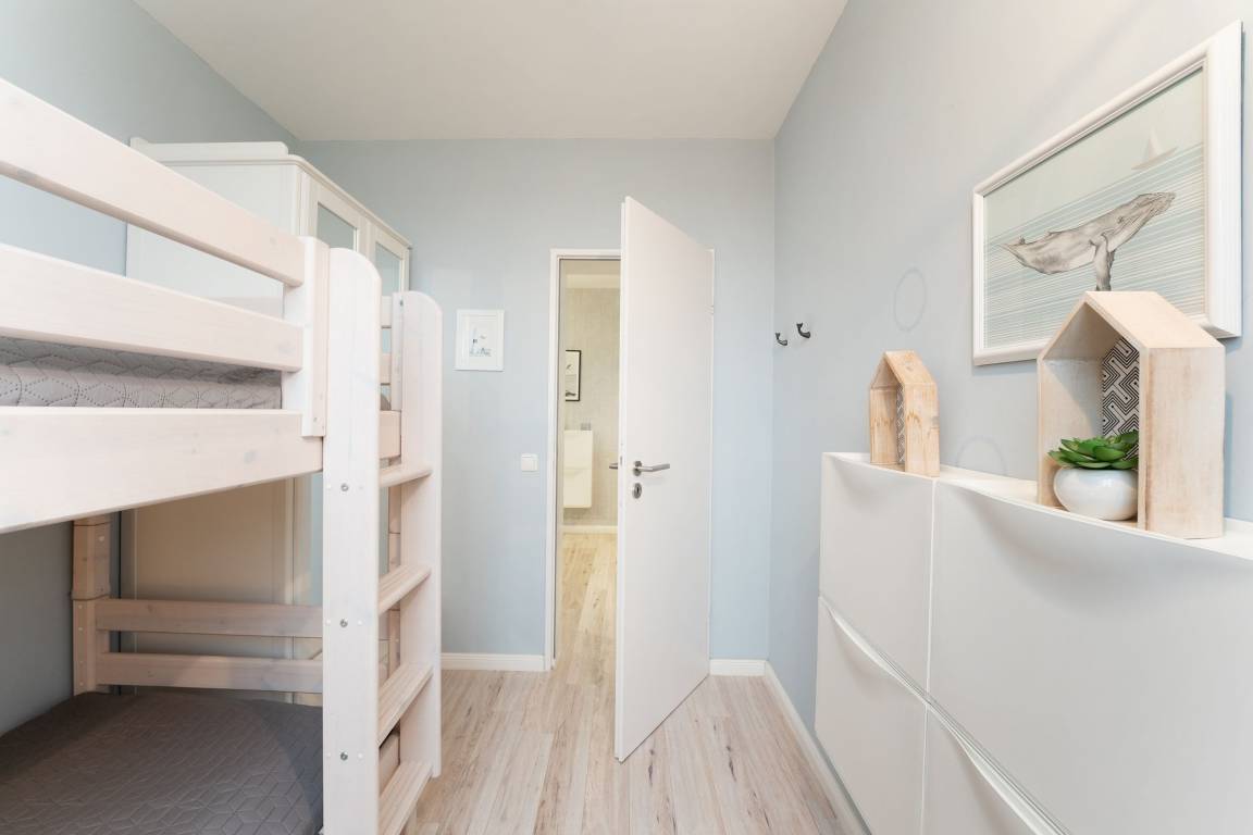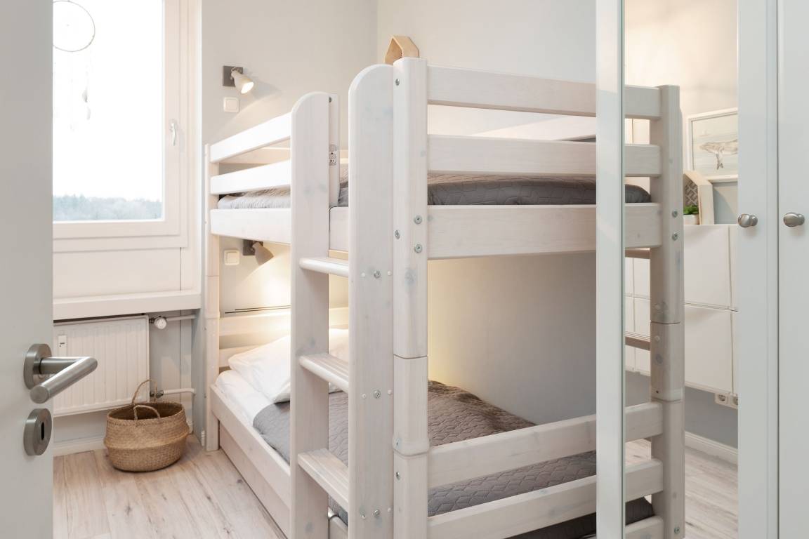 Schlafzimmer 2: 1 Etagenbett (2x 90x200 cm), Kleiderschrank, Verdunkelung (Rollos)