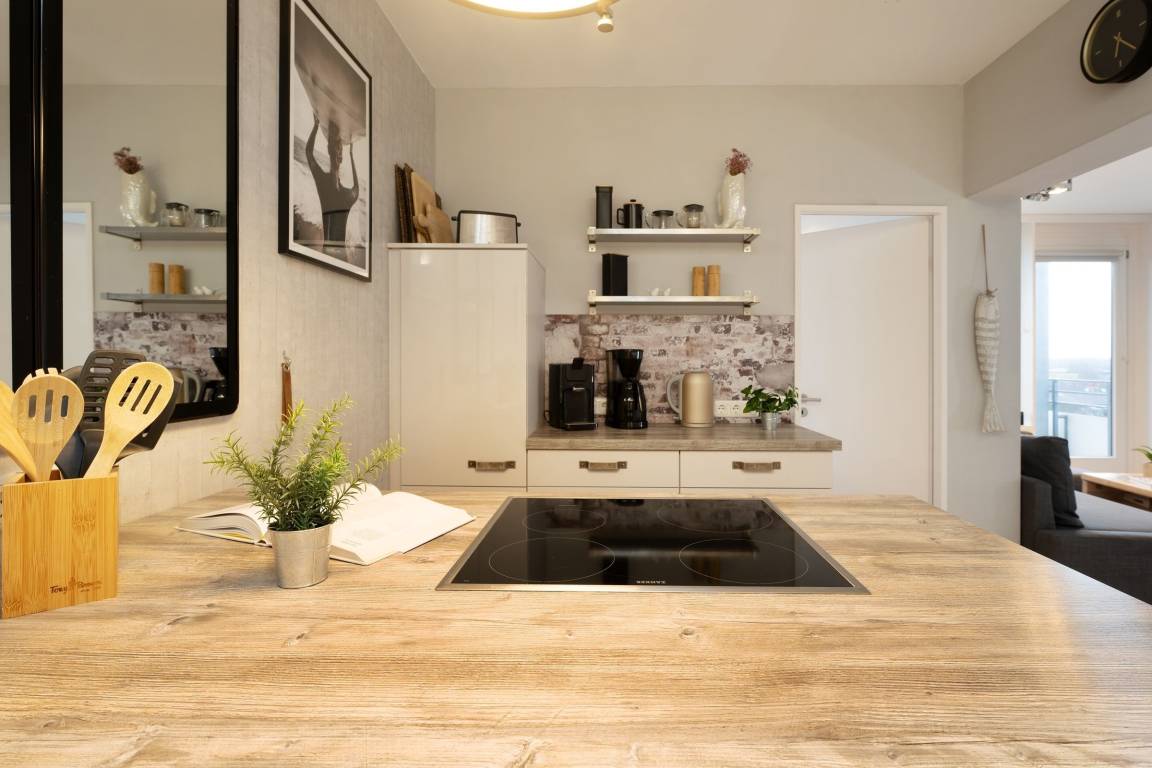 Ein traumhaft schönes und strandnahes Urlaubsdomizil erwartet Sie im Haus Meeresblick. Die Wohnung verfügt über eine pfiffig aufgeteilte EBK mit Backofen, Geschirrspüler, Kühlschrank mit separatem Gefrierschrank (2 Schubladen), Kaffeemaschine, Toaster etc. Vom offen gestalteten Wohnbereich mit Sofalandschaft und großem Essbereich gelangen Sie zum sonnigen Eckbalkon. Ein Schlafzimmer ist mit einem Doppelbett (je ca. 90x200 cm) und zusätzlichem TV-Gerät, ein weiteres Schlafzimmer mit Etagenbett (je ca. 90x190 cm) ausgestattet - hier kann auch bequem ein Kinderbettchen aufgestellt werden. Das moderne Duschbad mit WC komplettiert das Angebot. Ein WLAN-gratis-Angebot ist eine weitere Annehmlichkeit.