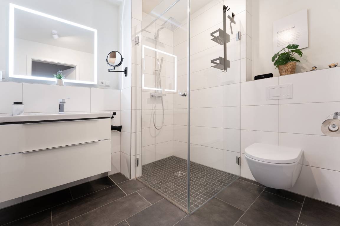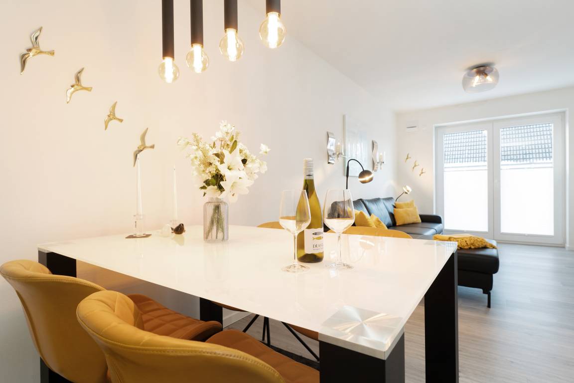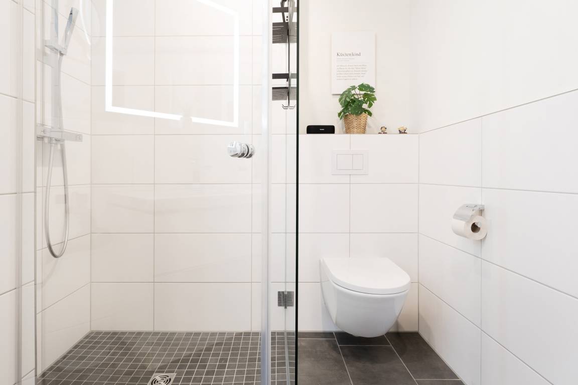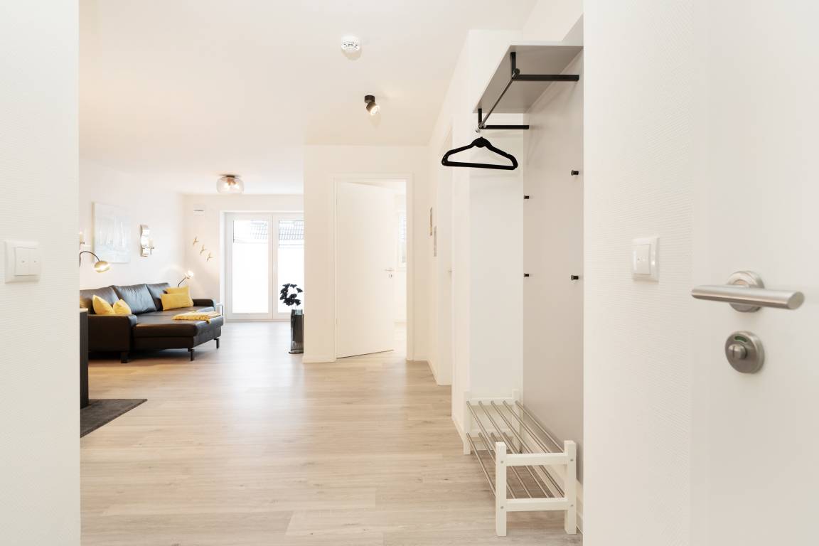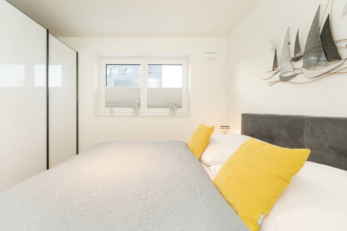 Diese moderne Ferienwohnung im 1. Obergeschoss besticht durch ihre helle und freundliche Einrichtung sowie die komfortable Ausstattung. Der offene Wohnbereich lädt mit einer gemütlichen Sofaecke, Flachbild-TV und Zugang zum sonnigen Balkon ein. Hier genießen Sie den Blick nach Süden und können wunderbar entspannen. Für besonders heiße Tage ist eine Markise vorhanden. Die angrenzende Küche ist voll ausgestattet und verfügt über Backofen, Induktionskochfeld, Geschirrspülmaschine, Kühlschrank mit Gefrierfach, Kaffeemaschine und Wasserkocher – ideal, um Ihre Lieblingsgerichte auch im Urlaub zuzubereiten. Der Essbereich bietet ausreichend Platz für gemeinsame Mahlzeiten. Im Schlafzimmer sorgt ein komfortables Doppelbett für erholsame Nächte. Das moderne Badezimmer ist mit Dusche, WC und Handtuchheizkörper ausgestattet. Als besonderes Highlight steht Ihnen hier zudem eine Sauna zur Eigennutzung zur Verfügung.