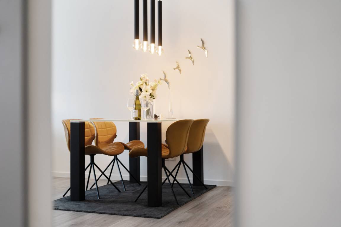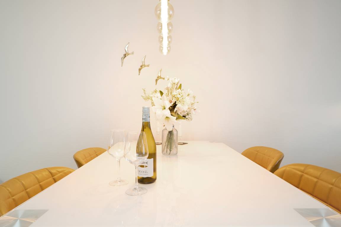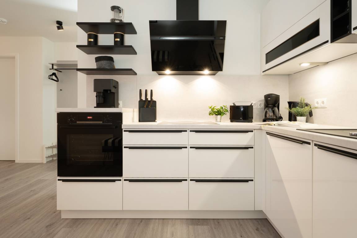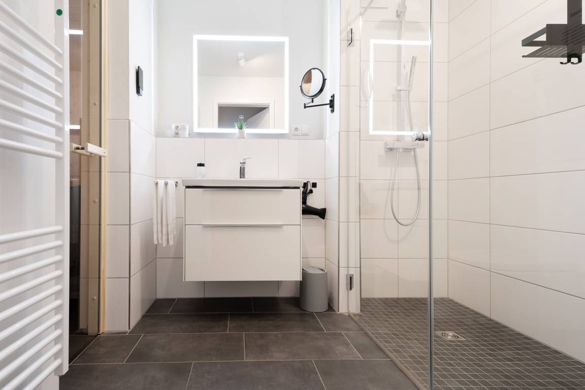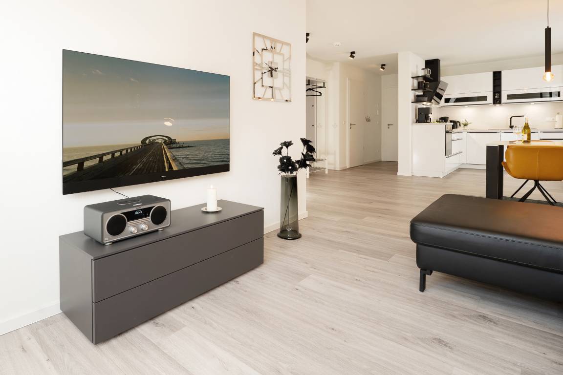 Diese moderne Ferienwohnung im 1. Obergeschoss besticht durch ihre helle und freundliche Einrichtung sowie die komfortable Ausstattung. Der offene Wohnbereich lädt mit einer gemütlichen Sofaecke, Flachbild-TV und Zugang zum sonnigen Balkon ein. Hier genießen Sie den Blick nach Süden und können wunderbar entspannen. Für besonders heiße Tage ist eine Markise vorhanden. Die angrenzende Küche ist voll ausgestattet und verfügt über Backofen, Induktionskochfeld, Geschirrspülmaschine, Kühlschrank mit Gefrierfach, Kaffeemaschine und Wasserkocher – ideal, um Ihre Lieblingsgerichte auch im Urlaub zuzubereiten. Der Essbereich bietet ausreichend Platz für gemeinsame Mahlzeiten. Im Schlafzimmer sorgt ein komfortables Doppelbett für erholsame Nächte. Das moderne Badezimmer ist mit Dusche, WC und Handtuchheizkörper ausgestattet. Als besonderes Highlight steht Ihnen hier zudem eine Sauna zur Eigennutzung zur Verfügung.
