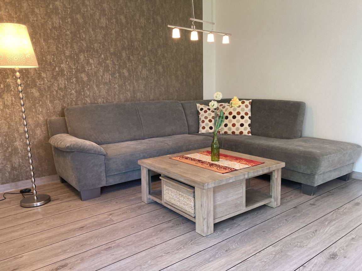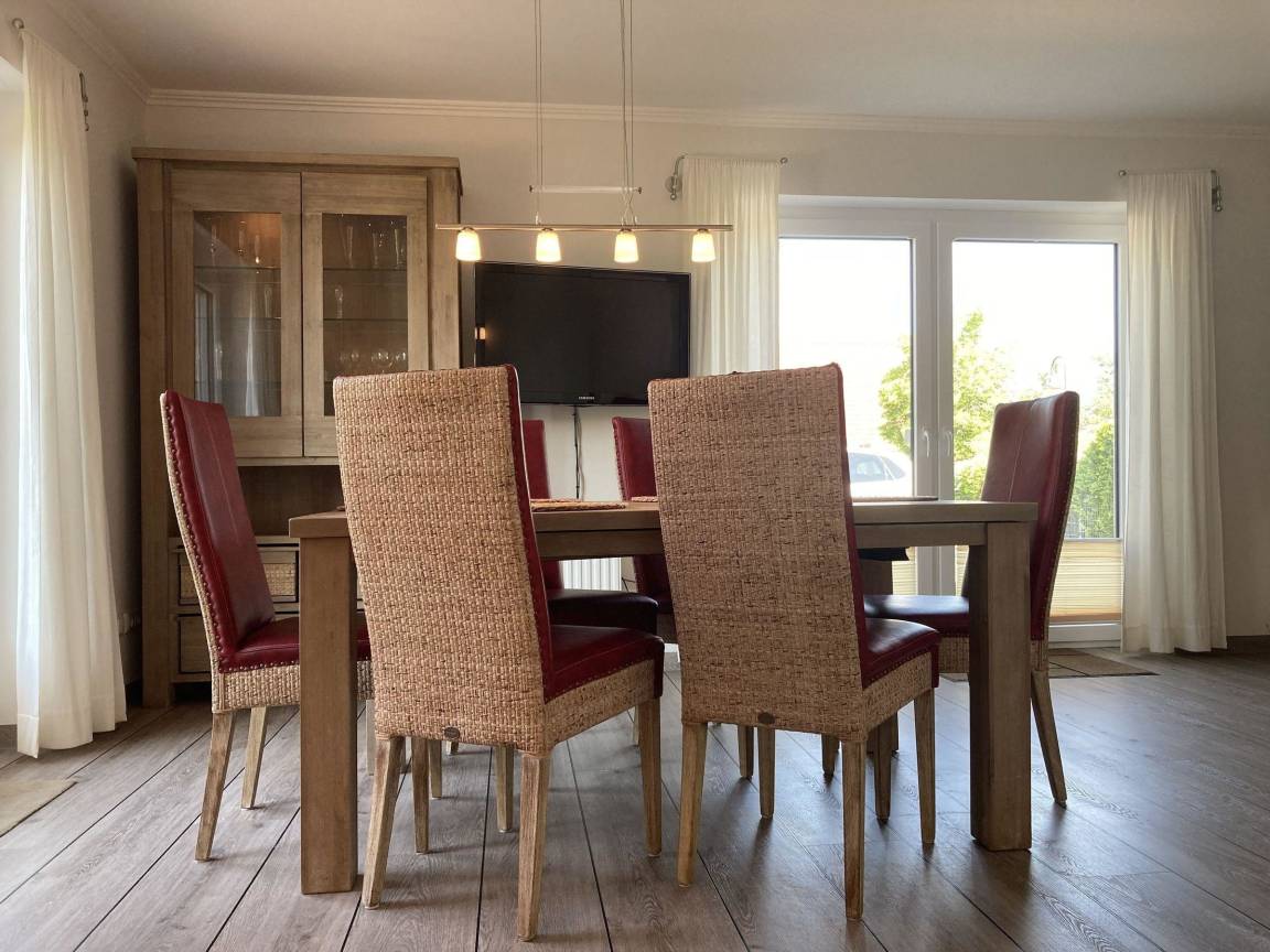 Die Doppelhaushälfte bietet Platz für bis zu 6 Personen auf 2 Etagen und befindet sich in ruhiger Lage, nur etwa 300 m vom Strand entfernt. Im Erdgeschoss befindet sich der Eingangsbereich mit Garderobe, ein geräumiges Wohnzimmer mit gemütlicher Couchecke und einem großen Esstisch, eine separate, helle Küche, ein Schlafraum mit 2 Einzelbetten (100 x 200 cm) sowie ein Badezimmer mit Dusche, WC und Waschmaschine.