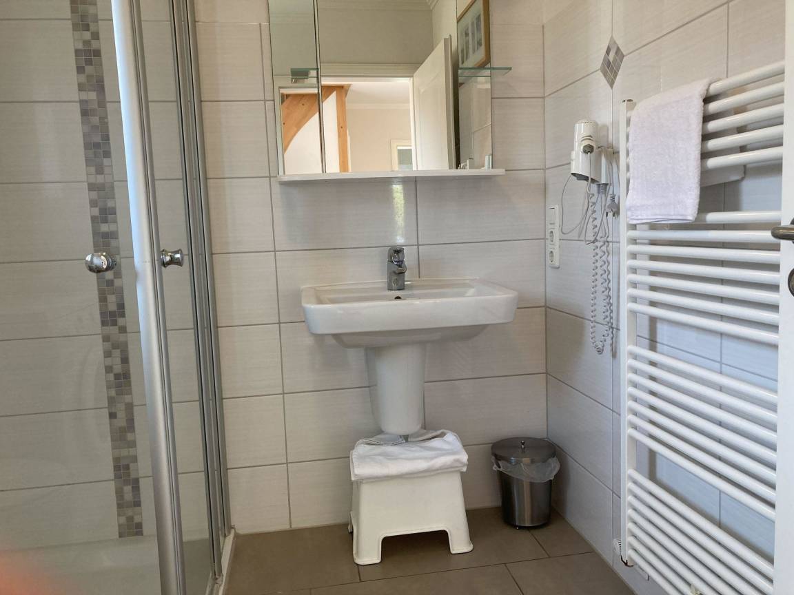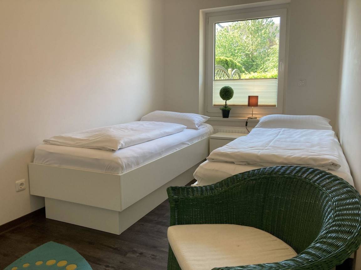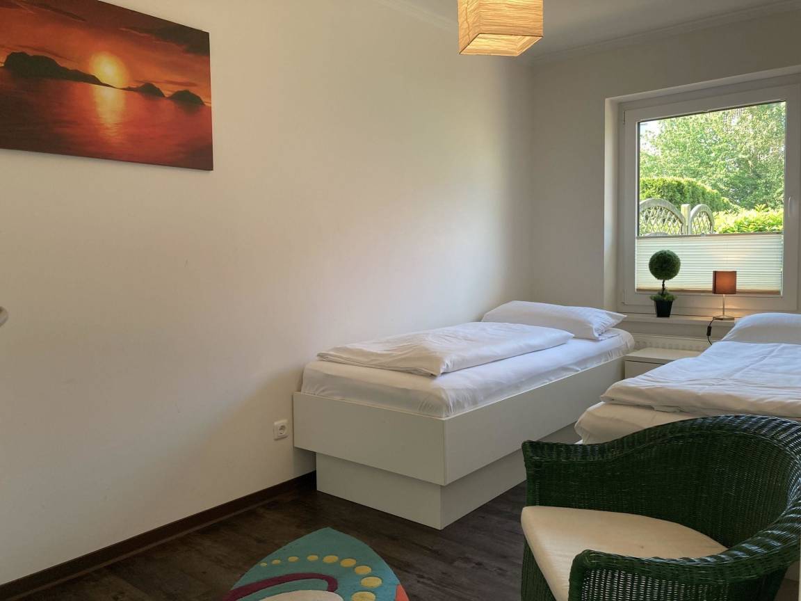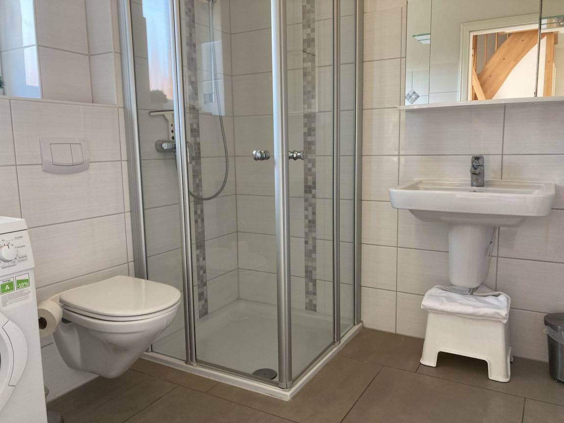 Im Obergeschoss gibt es zwei Schlafräume mit jeweils einem Doppelbett (2 Matratzen à 100 x 200 cm), Kleiderschrank und TV, sowie ein weiteres Badezimmer mit Badewanne und Dusche. Ein gemeinschaftlich genutzter Fahrradschuppen steht für die Unterbringung von Fahrrädern zur Verfügung. Ein PKW-Stellplatz ist direkt am Haus vorhanden. Bettwäsche muss bei Bedarf selbst mitgebracht werden. Haustiere sind gegen Gebühr erlaubt.