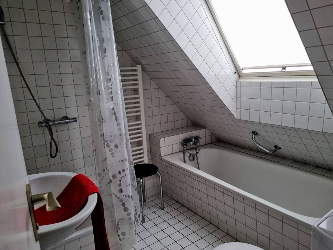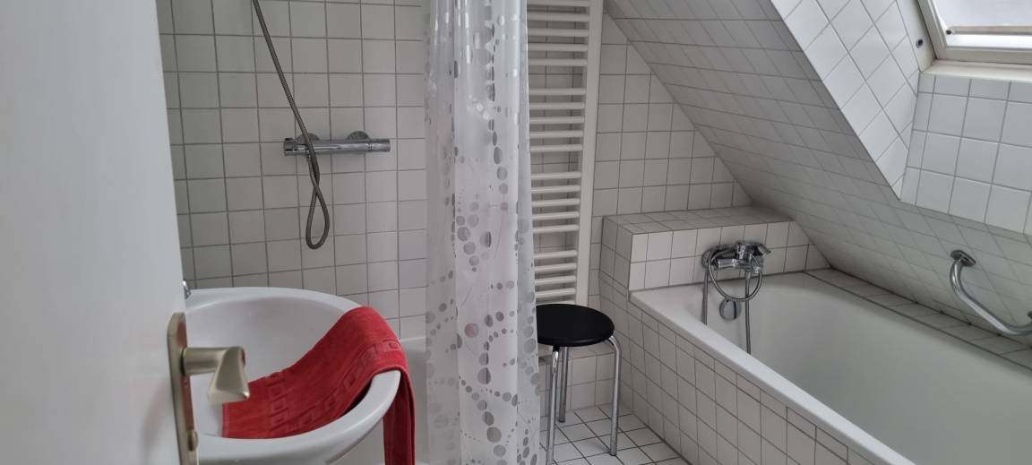 1 Schlafraum mit Doppelbett (kleines Kinderbett möglich), Wohnzimmer mit Doppelschlafcouch, Badewanne und Dusche