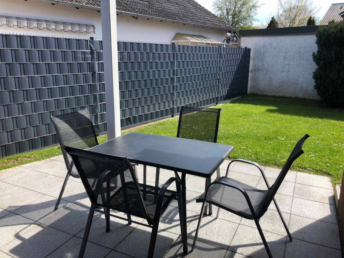 Zur modernen Ferienwohnung gehört eine ebenerdige Südost-Terrasse mit Tisch und Stühlen und direktem Zugang zum Rasen.