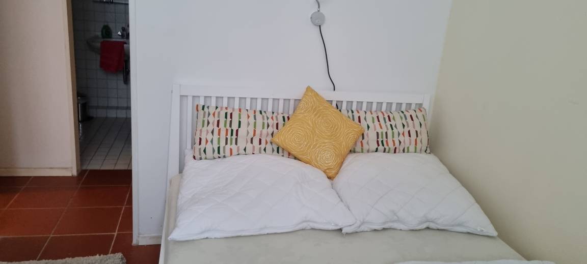 Im Wohnschlafzimmer gibt es einen Eßplatz für 2 Personen, eine Ikea Doppelliege mit 2 Lattenrosten und normalen