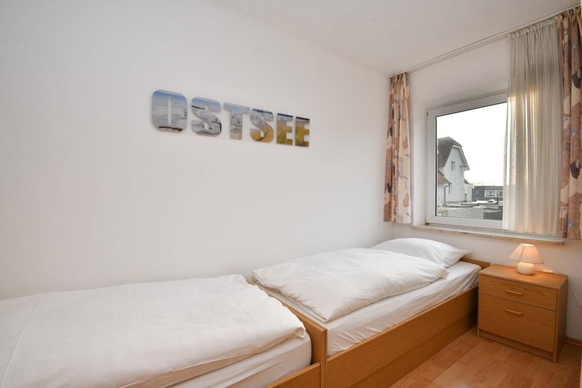 Schlafzimmer 2: 2 Einzelbetten (je 90x190 cm) stehen hintereinander, Kleiderschrank, Fußenden nicht offen.