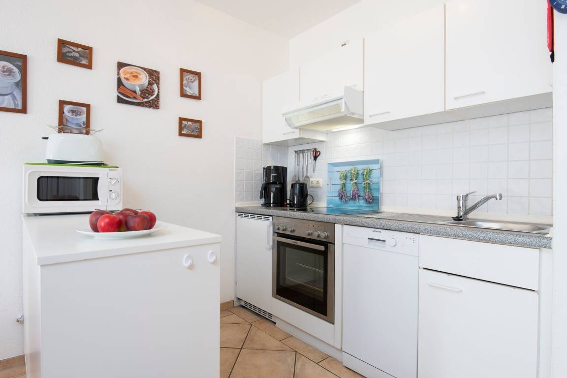 Ein kleines Raumwunder – die lichtdurchflutete Ferienwohnung besticht durch eine clevere Aufteilung. Es erwartet Sie eine kuschelige Sofa-Landschaft mit TV-Gerät zum abendlichen Entspannen. Direkt nebenan gelangen Sie auf den möblierten Süd-Balkon. Genießen Sie hier bei Sonnenschein leckere Speisen oder auch gute Gespräche. Sollte das Wetter einmal nicht so mitspielen, finden Sie in der schicken Essecke im Wohnbereich ebenfalls ein nettes Plätzchen zum Genießen. Die offene Küche mit Spülmaschine ist gut ausgestattet und schenkt durch einen kleinen Tresen als Raumteiler eine angenehme Atmosphäre. Für die Nacht stehen Ihnen zwei separate Schlafzimmer zur Verfügung: In dem einen Zimmer befindet sich ein Doppelbett (2x 90x200 cm), in dem anderen Zimmer stehen 2 Einzelbetten (je 90x190 cm) hintereinander. Das Duschbad mit Tageslicht ist schlicht und modern gehalten.