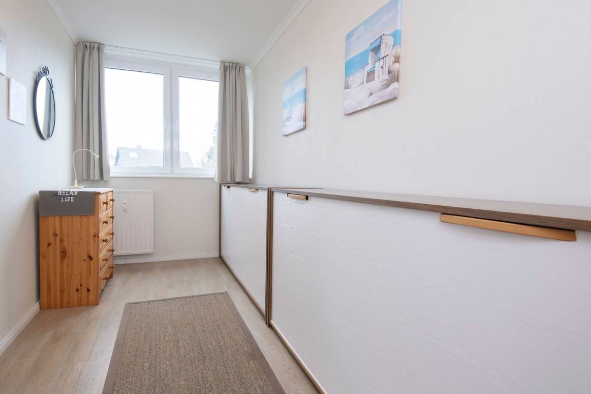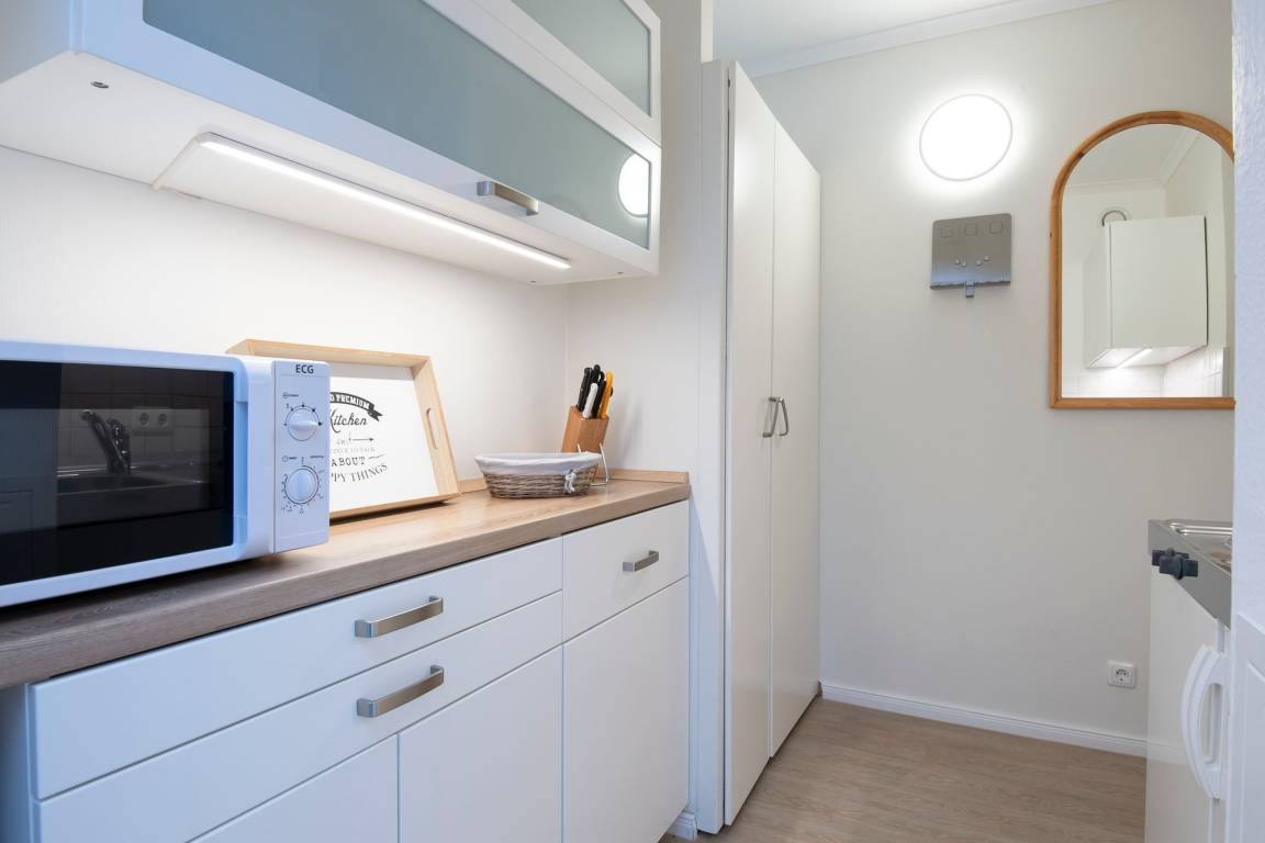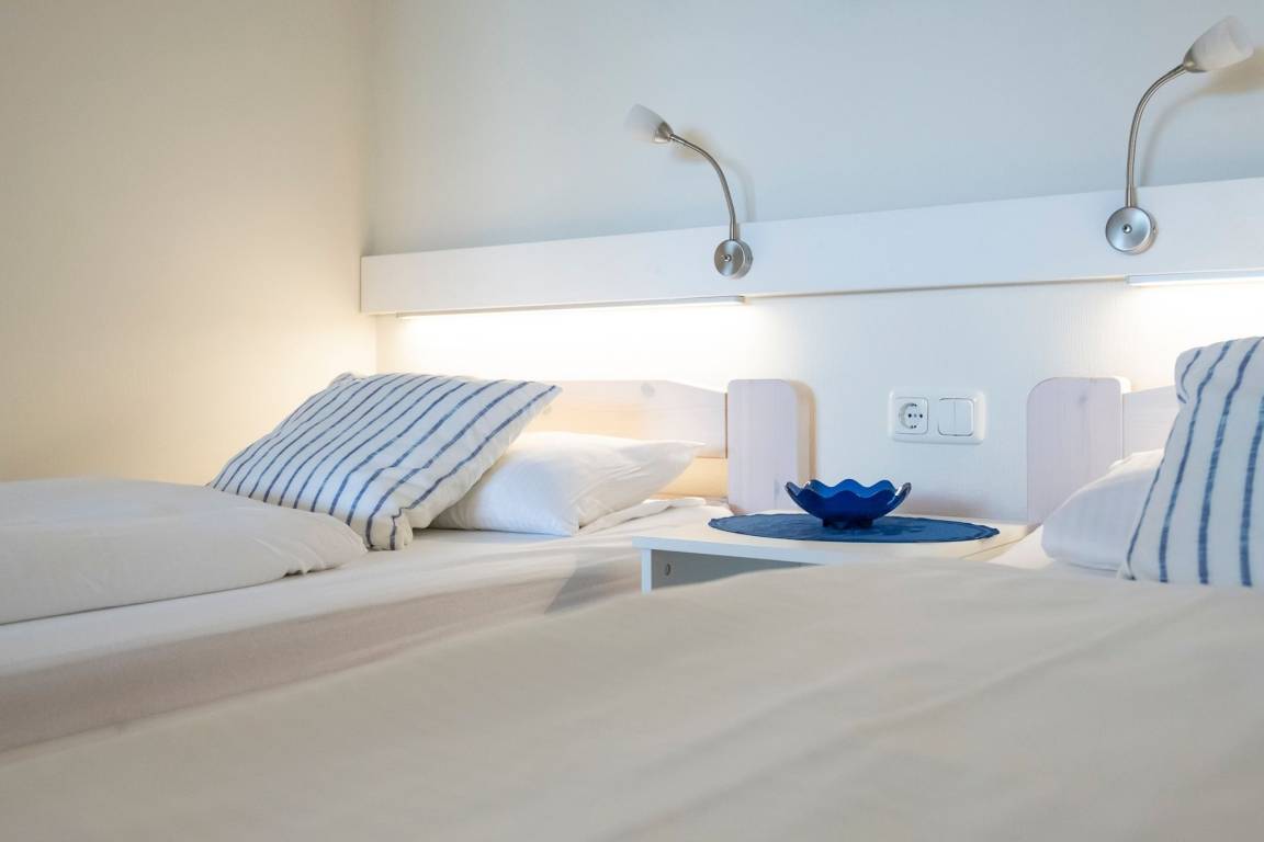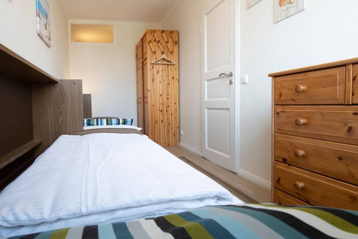 Im hellen Wohnbereich mit komfortabler Sofalandschaft, TV und behaglichem Essbereich trifft sich die ganze Familie zum Spielen, Relaxen, Essen, oder zum Filmeabend. Über den kostenlosen WLAN-Anschluss sind Sie auch im Urlaub erreichbar und die Kinder können ihre Lieblingsmusik oder -hörspiele streamen. Auch ein DAB plus Radio mit CD-Player und Bluetooth- Funktion sorgt für Unterhaltung. Von hier gelangen Sie auch auf den möblierten Balkon, auf dem Sie bei Sonnenschein ein ausgiebiges Frühstück an der gesunden Ostseeluft genießen können. Vom Wohnbereich, durch einen Vorhang abgetrennt, laden zwei separate Einzelbetten (je 90x200 cm) zum Träumen ein. In einem weiteren separaten Schlafzimmer befinden sich zwei platzsparende einklappbare Einzelbetten (je 90x200 cm), so ist tagsüber genügend Platz zum Spielen vorhanden. Ein Kleiderschrank bietet Stauraum für die mitgebrachte Urlaubsgarderobe. Die offene, kleine Küche verfügt über ein kleines Mikrowellen/Backofen-Kombigerät, einen Herd mit 2 Kochplatten, einen Kühlschrank und andere Annehmlichkeiten, so dass Sie sich während des Urlaubs auch selbst verpflegen können. Das Duschbad wurde komplett saniert und Dank der bodentiefen Dusche können Sie erfrischt in den Tag starten.