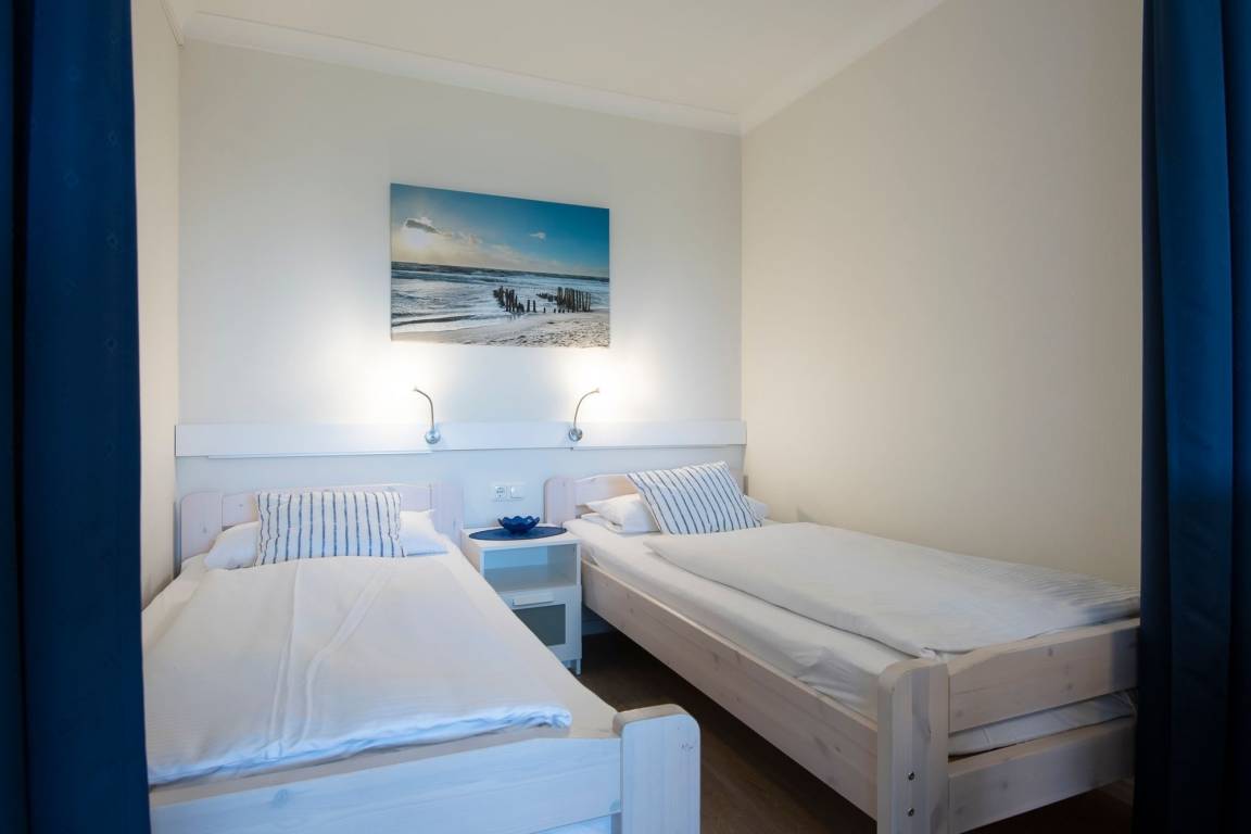 Schlafzimmer: 2 Einzel-Schrankbetten (2x 90x200 cm), Kleiderschrank, Verdunkelungsplissees vorhanden