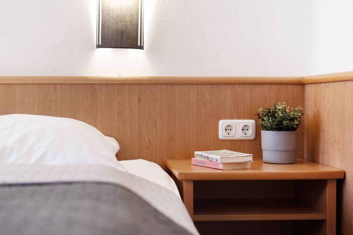 Wohn/ Schlafraum: 1 Doppelbett (180x200 cm), Kleiderschrank, TV, Verdunkelung (Rollos).
