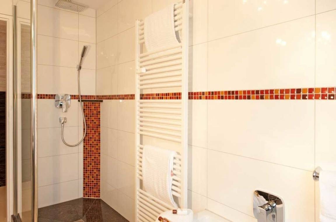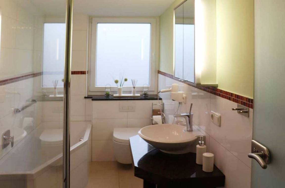 Das Badezimmer der Ferienwohnung ist mit einer Duschkabine (flacher Einstieg) und Badewanne ausgestattet.