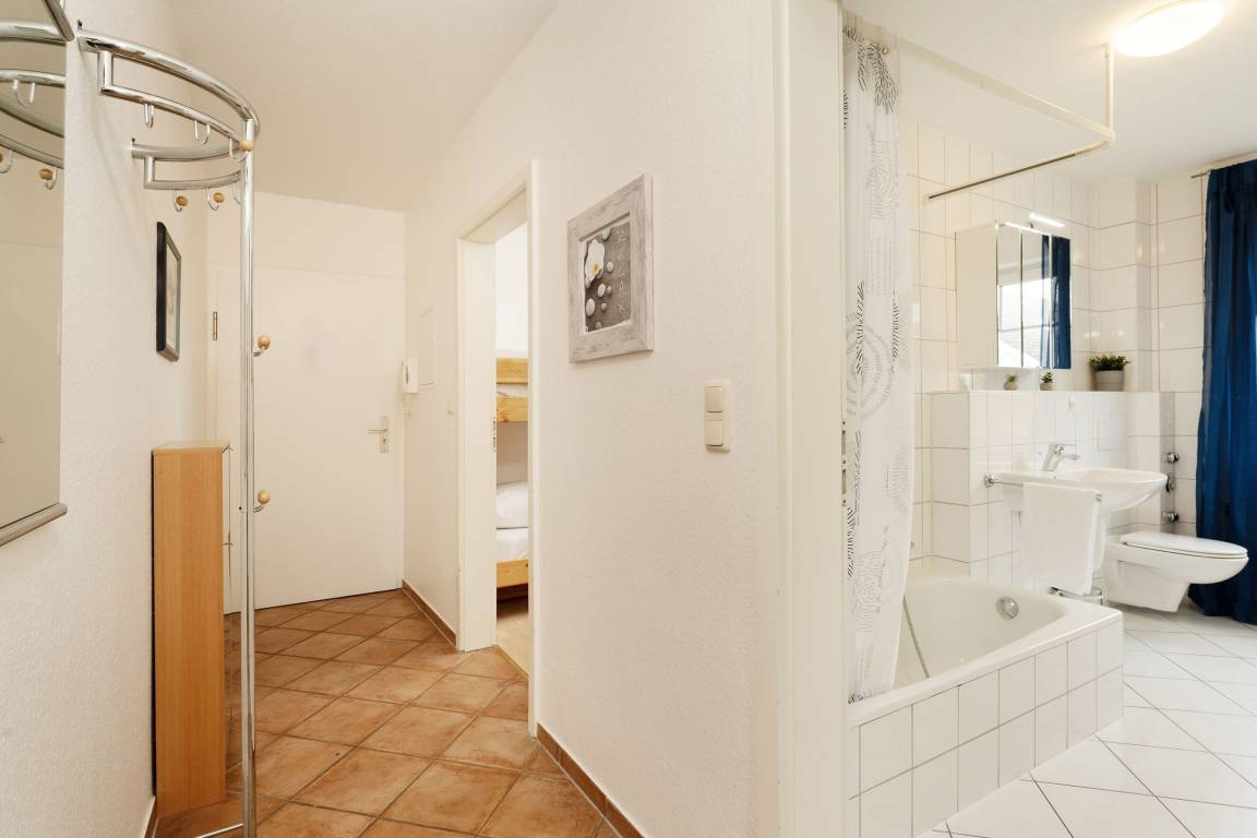 Das lichtdurchflutete Wohnzimmer im Hochparterre begrüßt Sie mit bequemer Sofa-Ecke, Kabel-TV, Stereo-Anlage und integriertem Essplatz sowie Balkon zur Seeseite. Genießen Sie den traumhaften Blick direkt Richtung Seebrücke und blau funkelnder Ostsee von Ihrem geschützten Balkon. Die separate Einbauküche ist mit Annehmlichkeiten wie 4-Platten-Ceran-Herd, Geschirrspüler, Mikrowelle und Kühlschrank mit Gefrierfach gut ausstaffiert. Das größere der oben liegenden Schlafzimmer ist mit hochwertigem Doppelbett (2 x 90x200cm) und Kleiderschrank, das Kinderzimmer mit Etagenbett (je 90x200 cm), Kleiderschrank und Schreibtisch möbliert. Das tageslichthelle Badezimmer ist großzügig und hell und sorgt mit wertiger Ausstattung wie Badewanne mit integrierter Dusche, beleuchtetem Spiegel, Hänge-WC und Kommode für Komfort.