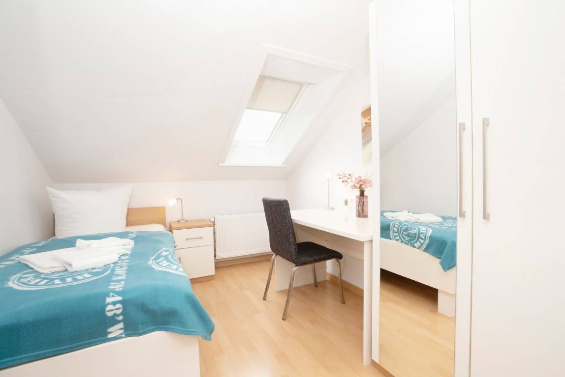 Schlafzimmer 2: 1 Einzelbett (90x200 cm), Kleiderschrank, Verdunkelung (Plissee)