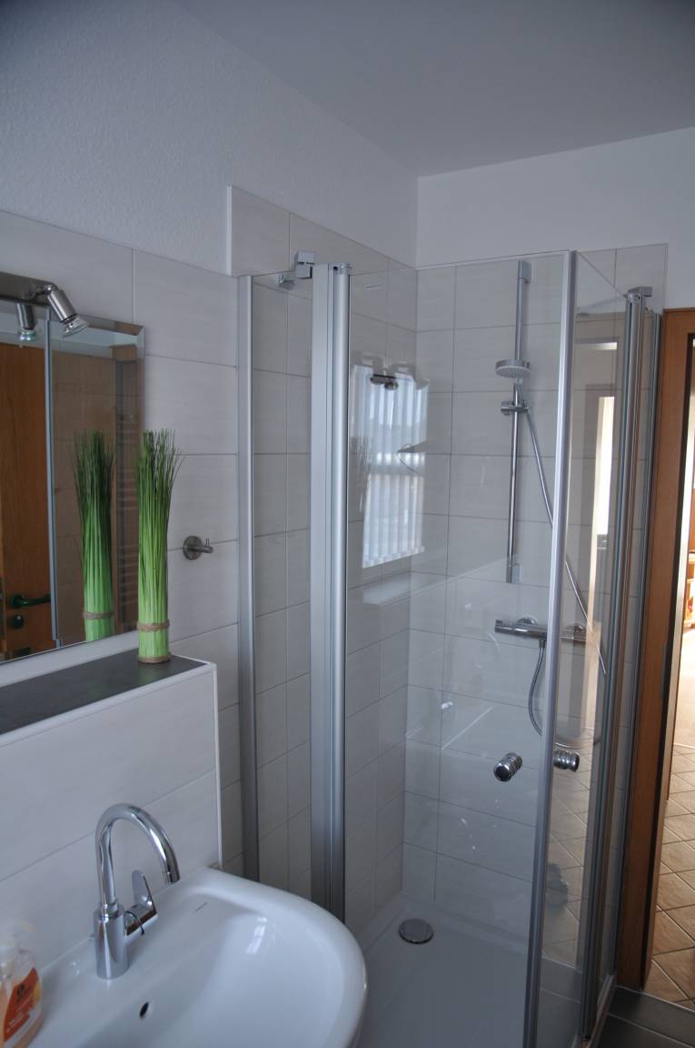 Das Bad ist mit Dusche, Waschtisch und WC ausgestattet und verfügt über ein Fenster mit Außenrollade.
