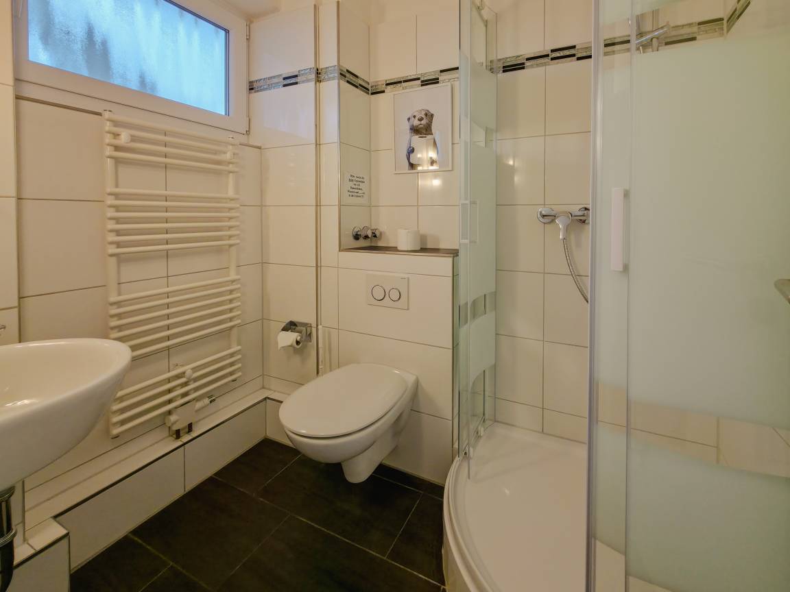 Eine separate Küchenzeile steht Gästen ebenfalls zur Verfügung wie ein hübsches Bad mit Dusche (hoher Einstieg) und WC und ein Flur mit Garderobe.