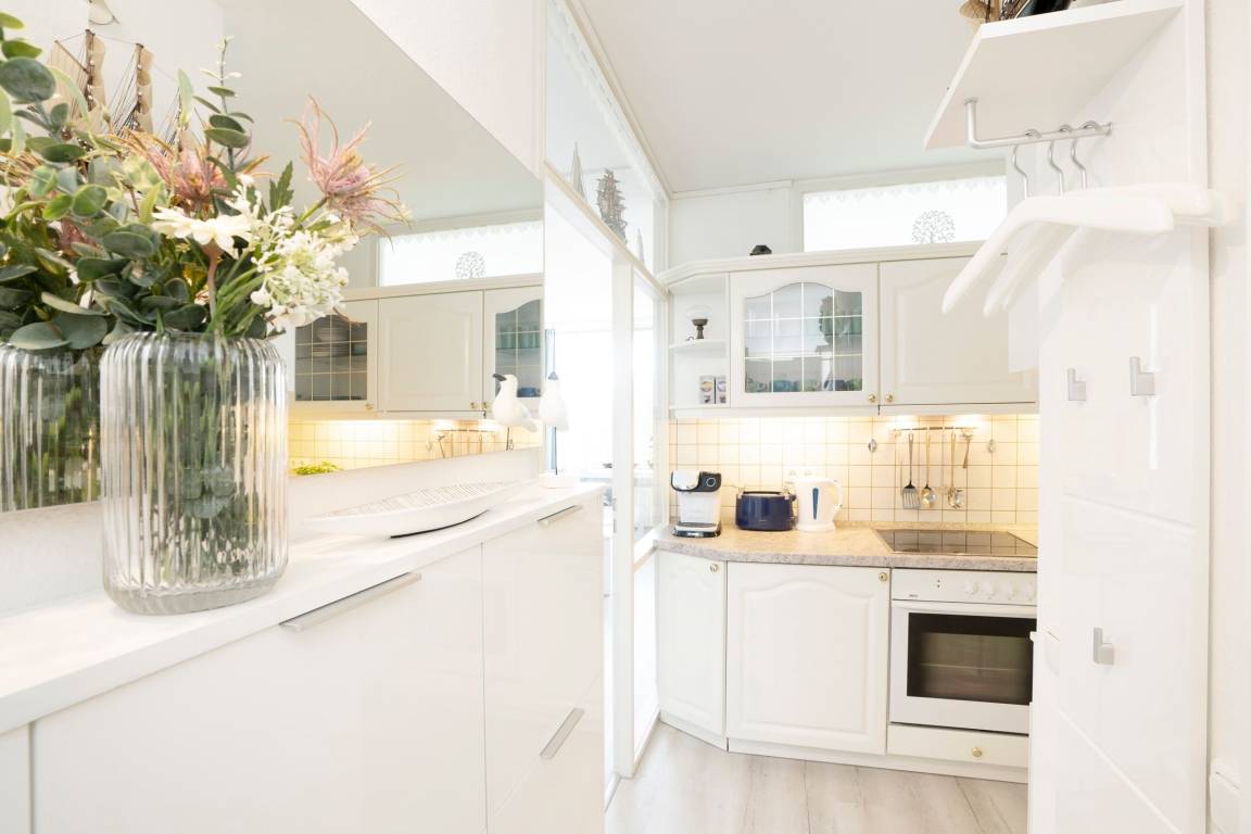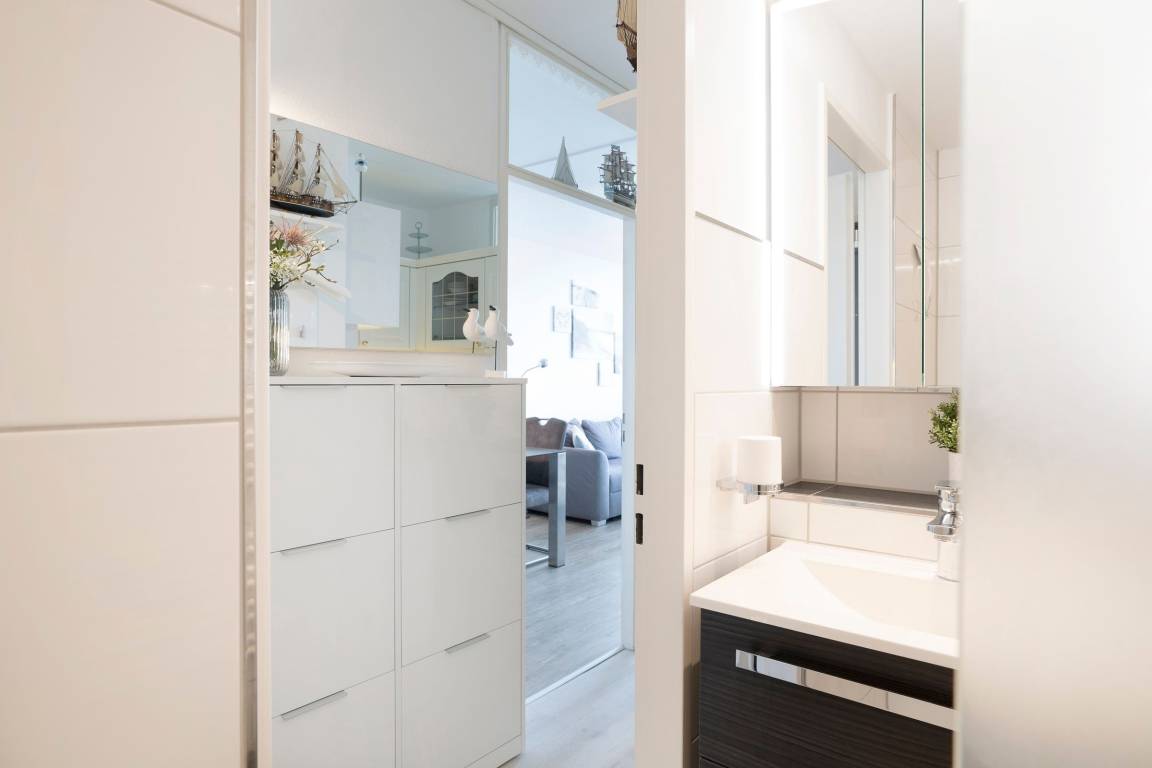 Im kombinierten Wohn-/Schlafraum erwartet Sie ein bequemes Doppel-Boxspringbett (2x 80x200 cm), ein Einzelbett (90x200 cm), ein gemütliches Ecksofa sowie ein Flachbildfernseher. In der voll ausgestatteten Küche können Sie köstliche Urlaubsmahlzeiten zubereiten, der Essbereich bietet ausreichend Platz für alle Gäste. Von hier aus gelangen Sie auf den möblierten Balkon, von dem Sie einen herrlichen Meerblick genießen und den Tag in Ruhe ausklingen lassen können. Das moderne Badezimmer mit Dusche und Handtuchwärmer rundet das Angebot dieser Ferienwohnung ab.