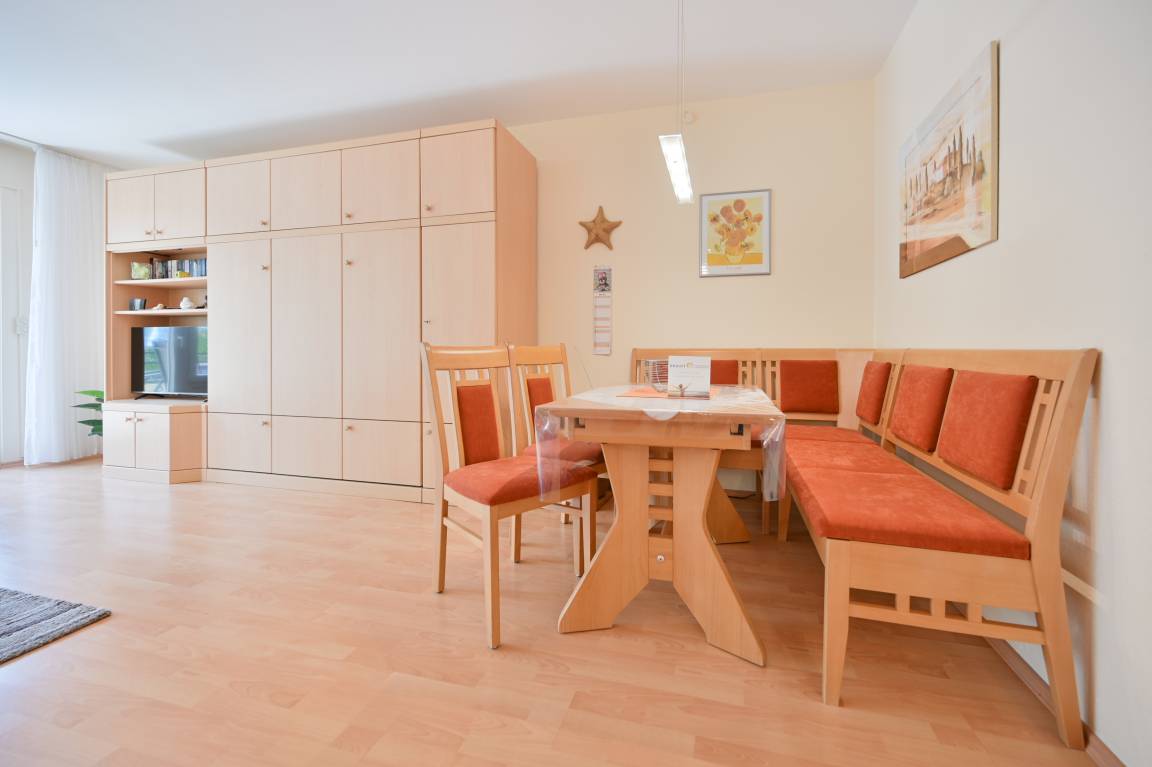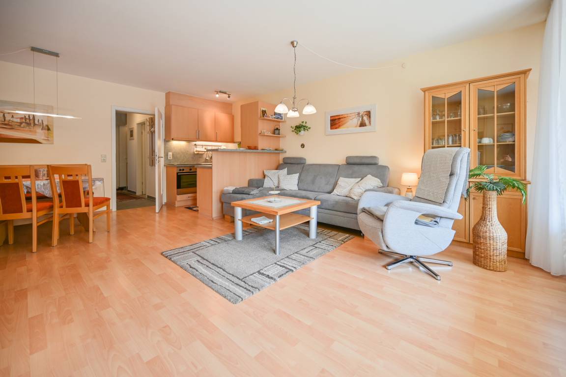 Die Ferienwohnung von Familie Klecha im Ostseebad Kellenhusen verfügt über ein Wohnzimmer mit 3er Couch, 2er Couch, Sessel, Couchtisch, Vitrine, Schrankbett für 2 Personen, Essecke mit Tisch, Eckbank und zwei Stühlen sowie Balkonzugang. Zur Wohnung gehören außerdem eine Einbauküche und ein Schlafzimmer mit zwei Einzelbetten und einem Kleiderschrank.